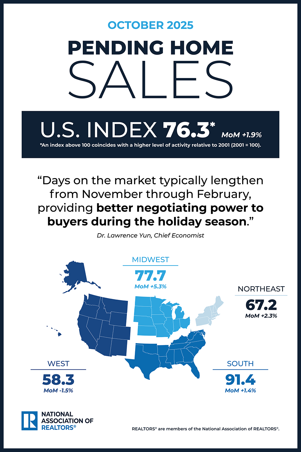 "Home sales increased in October even with the government shutdown due to homebuyers taking advantage of lower mortgage rates," said NAR Chief Economist Lawrence Yun. "First-time homebuyers are facing headwinds in the Northeast due to a lack of supply and in the West because of high home prices. First-time buyers fared better in the Midwest because of the plentiful supply of affordable houses and in the South because there is sufficient inventory."