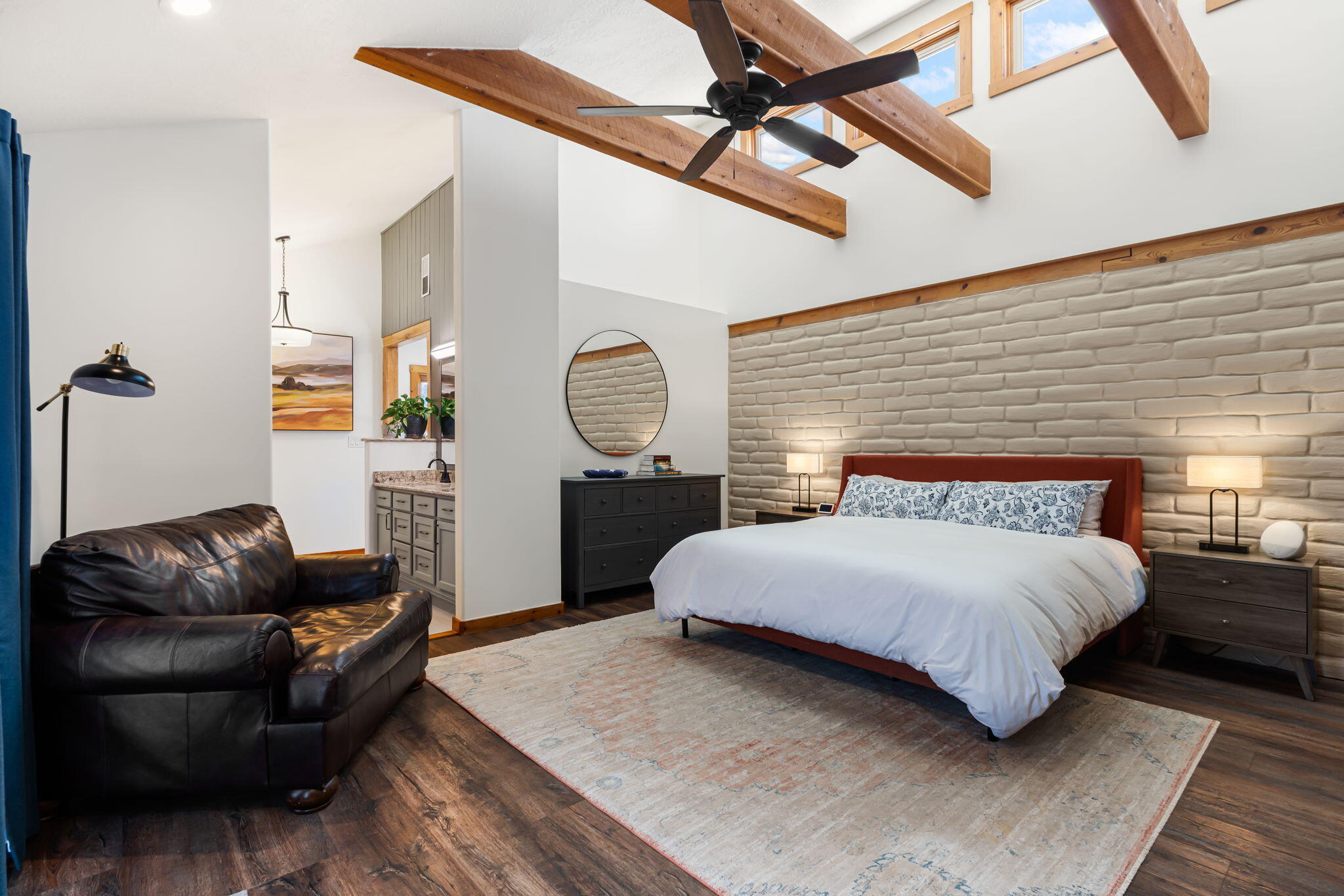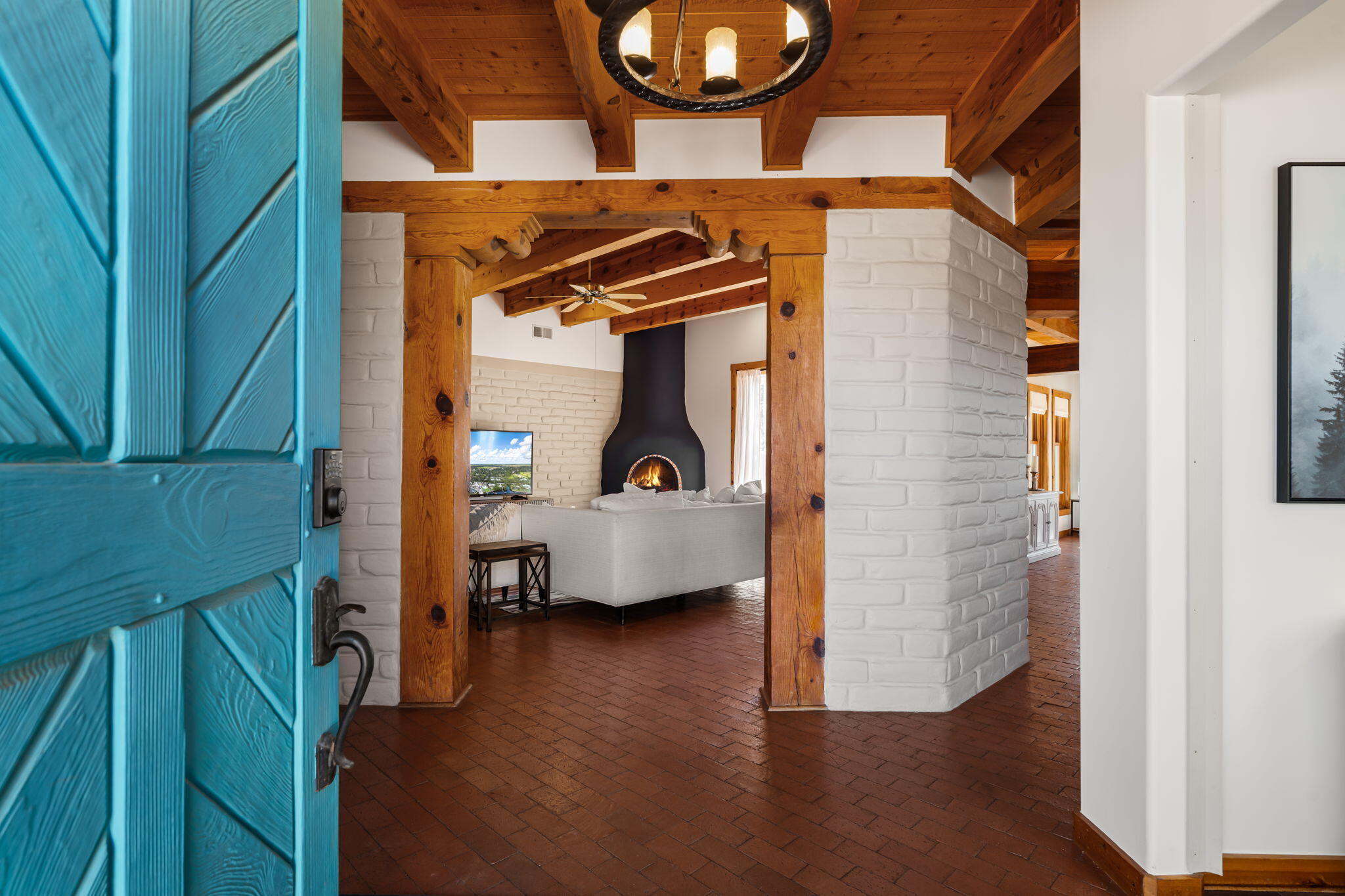 Authentic Southwest charm abounds in this 4BDR/3BA/3.5CG home in Placitas Trails! Private courtyard entrance & open brick patio. Wood beam ceilings, adobe interior wall, wood kiva fireplace, beautiful brick flooring. Kitchen features Fusion quartzite countertops, island/bar, tile backsplash, gas stove. Primary bdr features wood beam ceiling, clerestory windows, outdoor deck, walk-in closet, beautifully remodeled bath with quartz countertops, lighting & hardware, tile flooring, deep tub, custom shower, built-in cabs, linen closet. Updated half bath, vanity, mirror, flooring & lighting. Incredible outdoor living space with hot tub & multiple patios off kitchen & living area to dine al fresco & entertain family friends! 2CG plus detached 1.5CG, approx. .75 acre lot, circle drive, natural