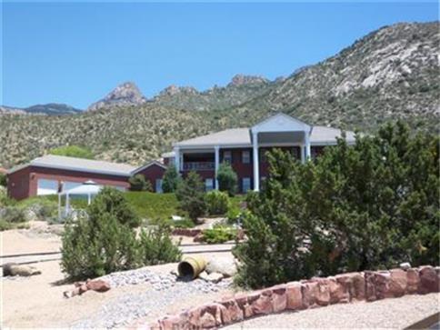 Nestled in the shadows of the Sandia Mtns, this incredible home captures the feel of a plantation style mansion offering sweeping/breathtaking views of city/mtns. Tasteful int boasts 5 spacious BDRMS w/2 mstr stes on main level/1 enhanced by FP & lux bath w/jetted tub. Majestic custom staircase opens to grt rm w/expansive flr to clng windows/2nd liv area/perfect for media or library/gourmet eat-in dream kit & dining rm help create fabulous entertaining environment. Impeccably lndscped 4 AC too!