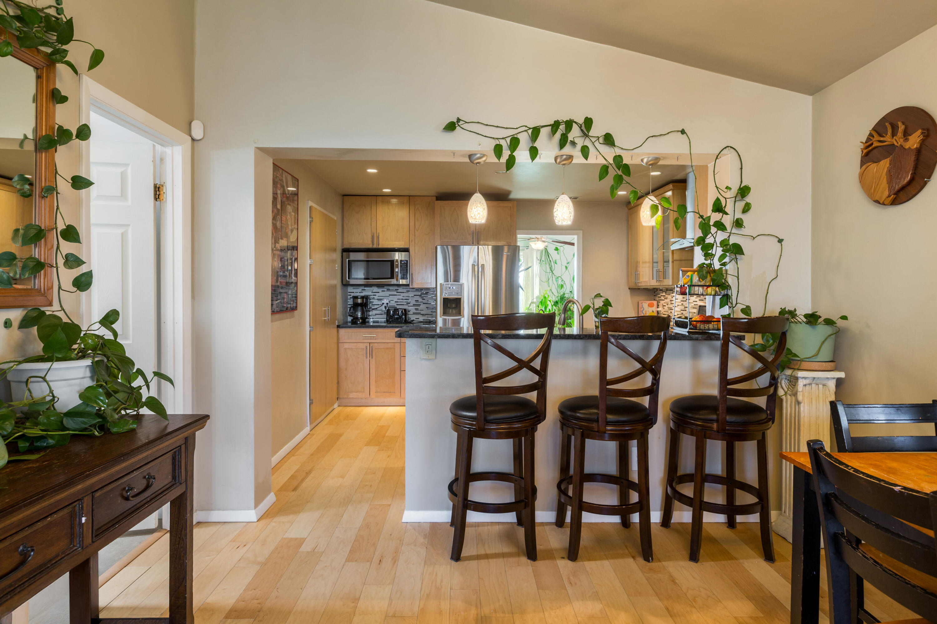 Gorgeous 3BDR/2BA home in Hoffmantown Addition neighborhood! Close to Foothill trails, Uptown shopping, restaurants, parks & schools! Two living areas w/sunny front room & cozy wood burning stove! Big picture windows with lots of natural light! Beautiful modern kitchen with lots of storage, gas stove, built-in micro, bkfst bar & pantry! Spacious primary suite features 2 walk-in closets, separate shower, dual sink vanity & skylight! Updates include two water heaters (2016), roof (2021), & laminate plank flooring! Open great room & dining area w/patio access to the beautiful backyard featuring a pool and extended covered patio, enjoy dining al fresco & entertaining family & friends; backyard access & mountain views!