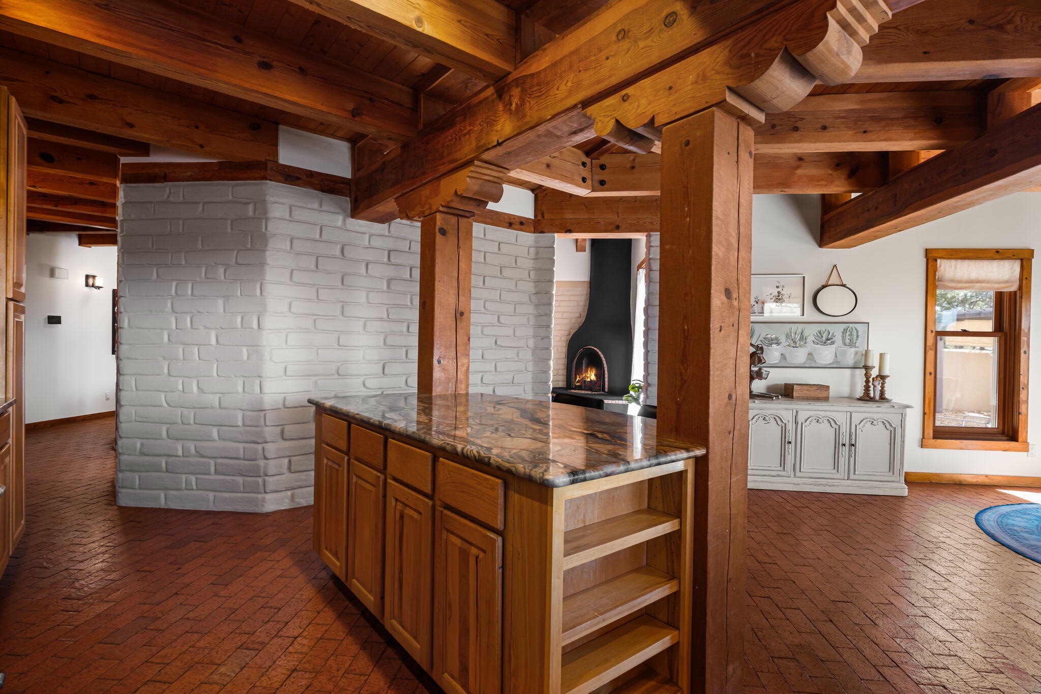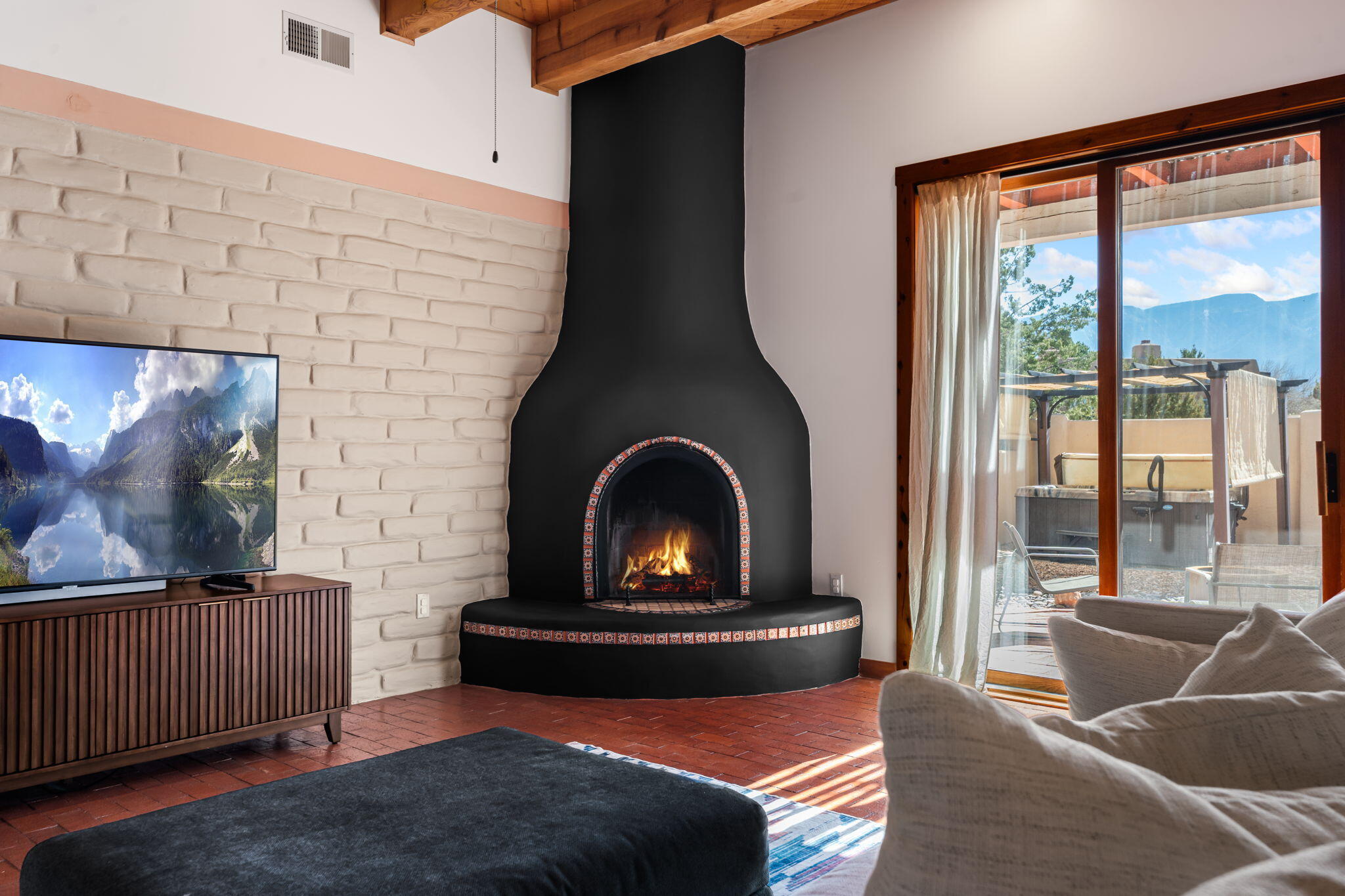 Authentic Southwest charm abounds in this 4BDR/3BA/3.5CG home in Placitas Trails! Private courtyard entrance & open brick patio. Wood beam ceilings, adobe interior wall, wood kiva fireplace, beautiful brick flooring. Kitchen features Fusion quartzite countertops, island/bar, tile backsplash, gas stove. Primary bdr features wood beam ceiling, clerestory windows, outdoor deck, walk-in closet, beautifully remodeled bath with quartz countertops, lighting & hardware, tile flooring, deep tub, custom shower, built-in cabs, linen closet. Updated half bath, vanity, mirror, flooring & lighting. Incredible outdoor living space with hot tub & multiple patios off kitchen & living area to dine al fresco & entertain family friends! 2CG plus detached 1.5CG, approx. .75 acre lot, circle drive, natural
