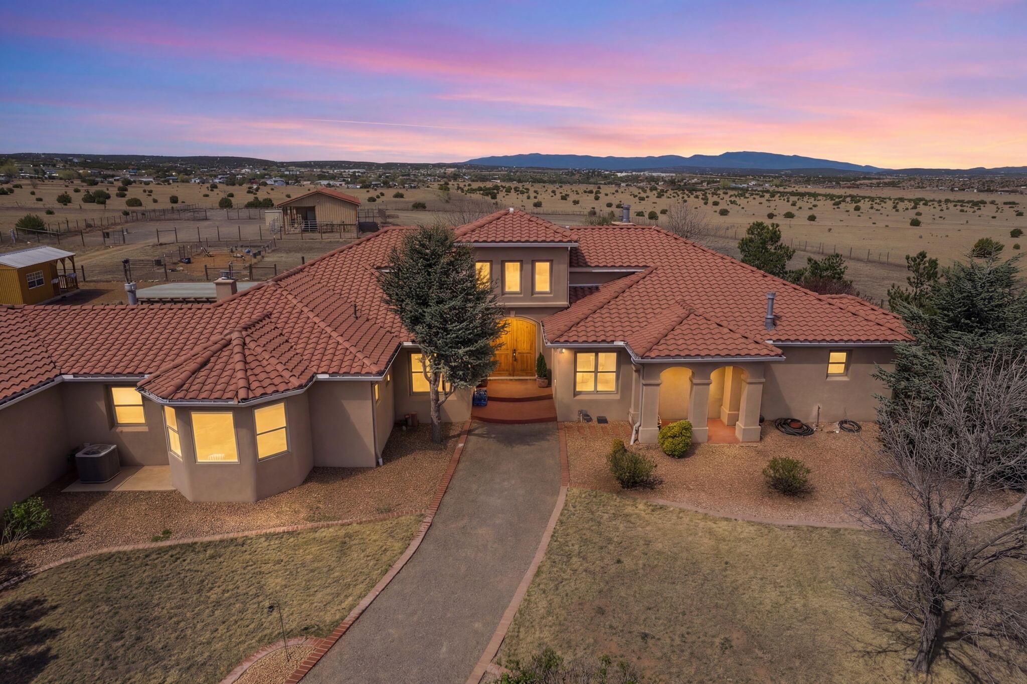 Set upon 5 acres in beautiful Edgewood, this luxury equestrian-property is a rare find!! Designed for both comfort & functionality, this property blends modern upgrades with wide-open New Mexico views. Step inside to soaring ceilings, new laminate flooring, and plush new carpet throughout. The open floorplan offers an airy living space ideal for entertaining, while the dedicated office--with its own exterior access--makes working from home a breeze. The kitchen features a new cooktop, new dishwasher, custom-built pantry shelving, & flows seamlessly into the main living areas featuring built-in speakers for surround sound enjoyment. The primary suite boasts a spacious walk-in closet enhanced with custom built-ins, & the home is equipped with a new water softener & filtration system