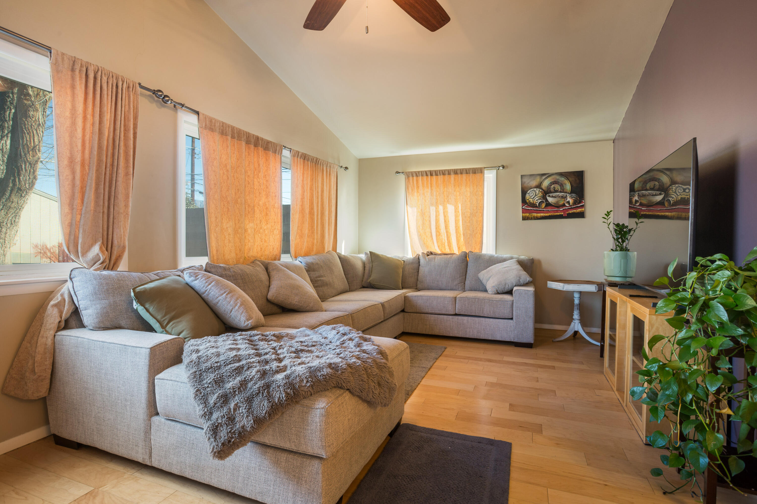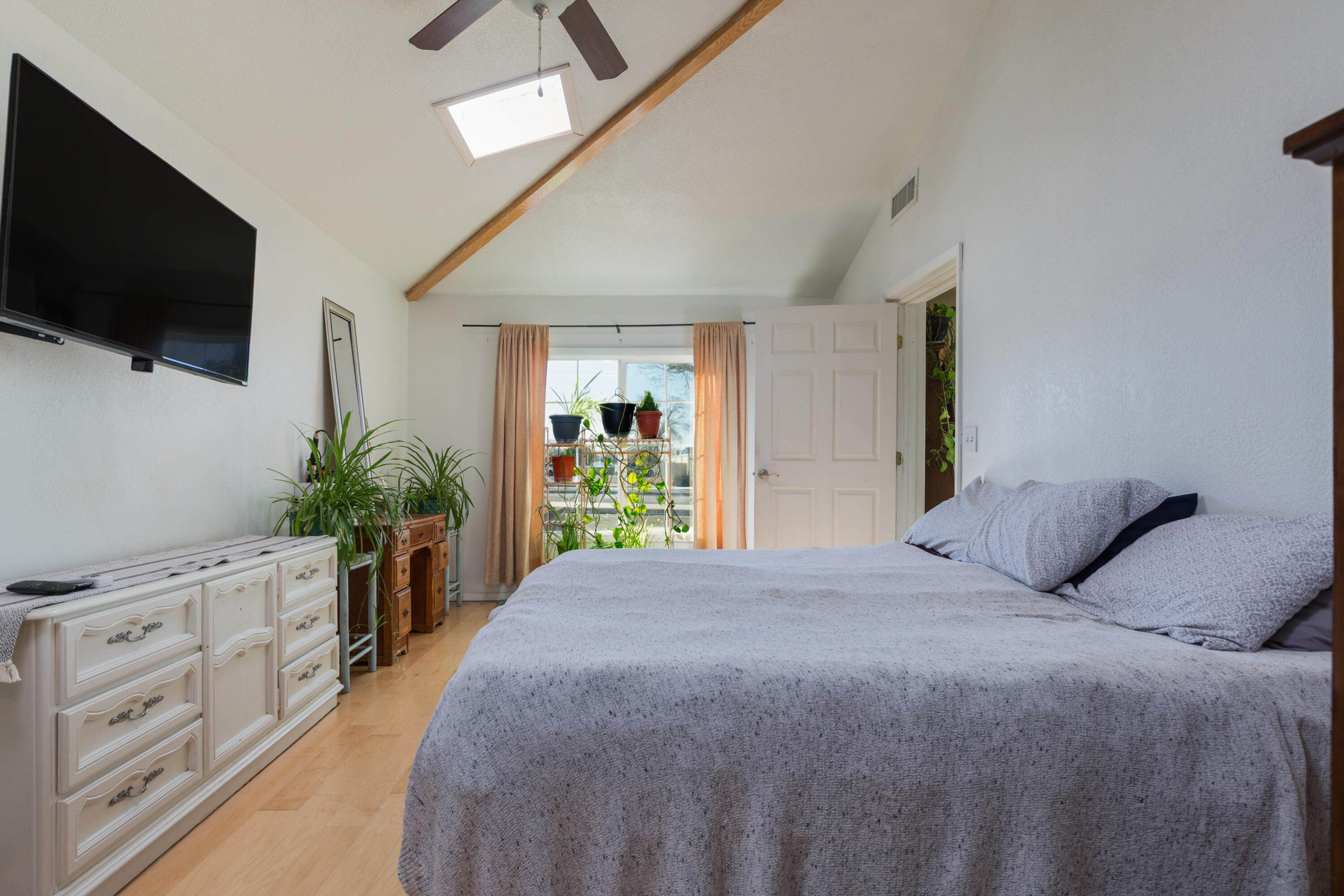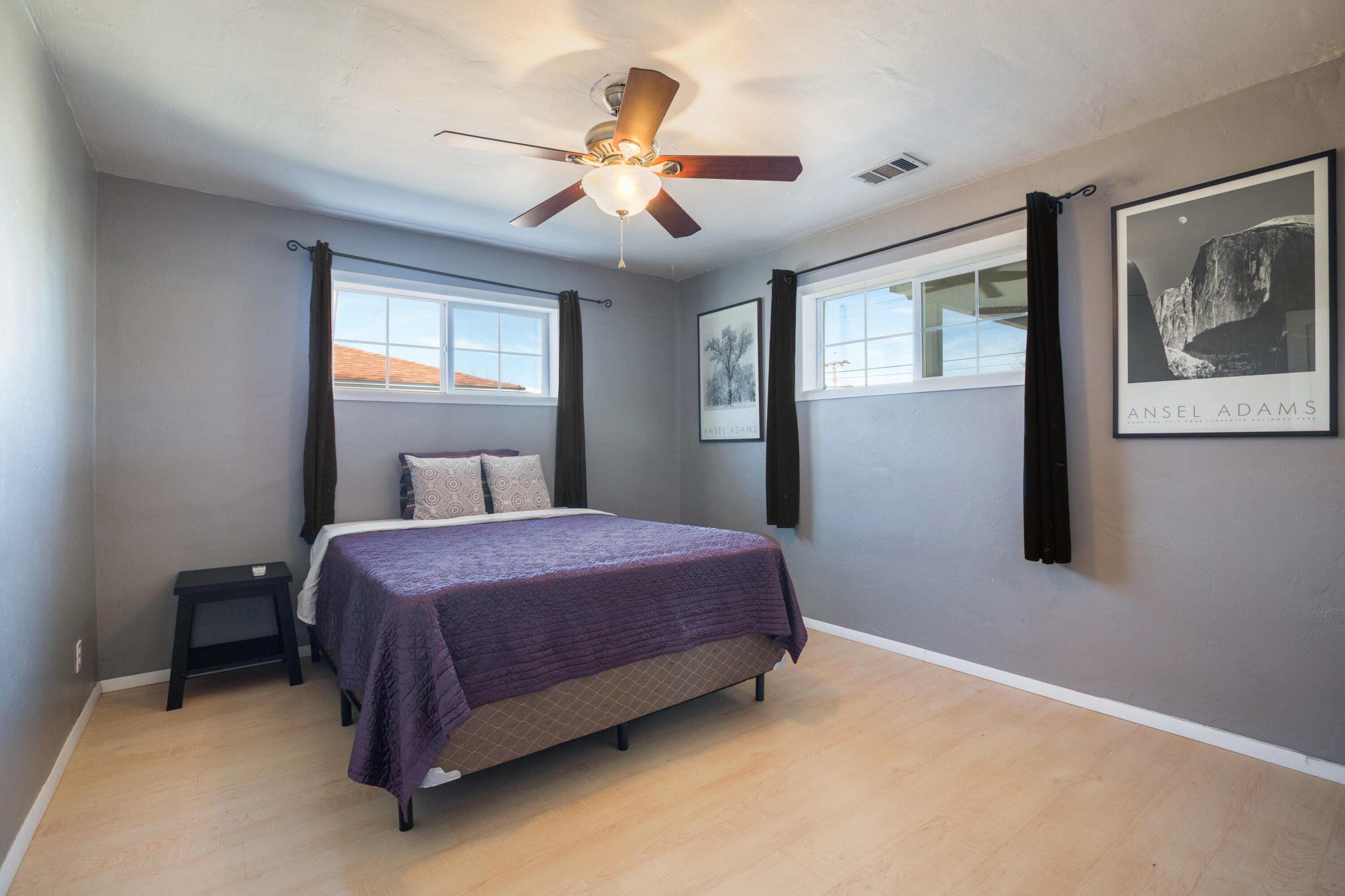 Gorgeous 3BDR/2BA home in Hoffmantown Addition neighborhood! Close to Foothill trails, Uptown shopping, restaurants, parks & schools! Two living areas w/sunny front room & cozy wood burning stove! Big picture windows with lots of natural light! Beautiful modern kitchen with lots of storage, gas stove, built-in micro, bkfst bar & pantry! Spacious primary suite features 2 walk-in closets, separate shower, dual sink vanity & skylight! Updates include two water heaters (2016), roof (2021), & laminate plank flooring! Open great room & dining area w/patio access to the beautiful backyard featuring a pool and extended covered patio, enjoy dining al fresco & entertaining family & friends; backyard access & mountain views!