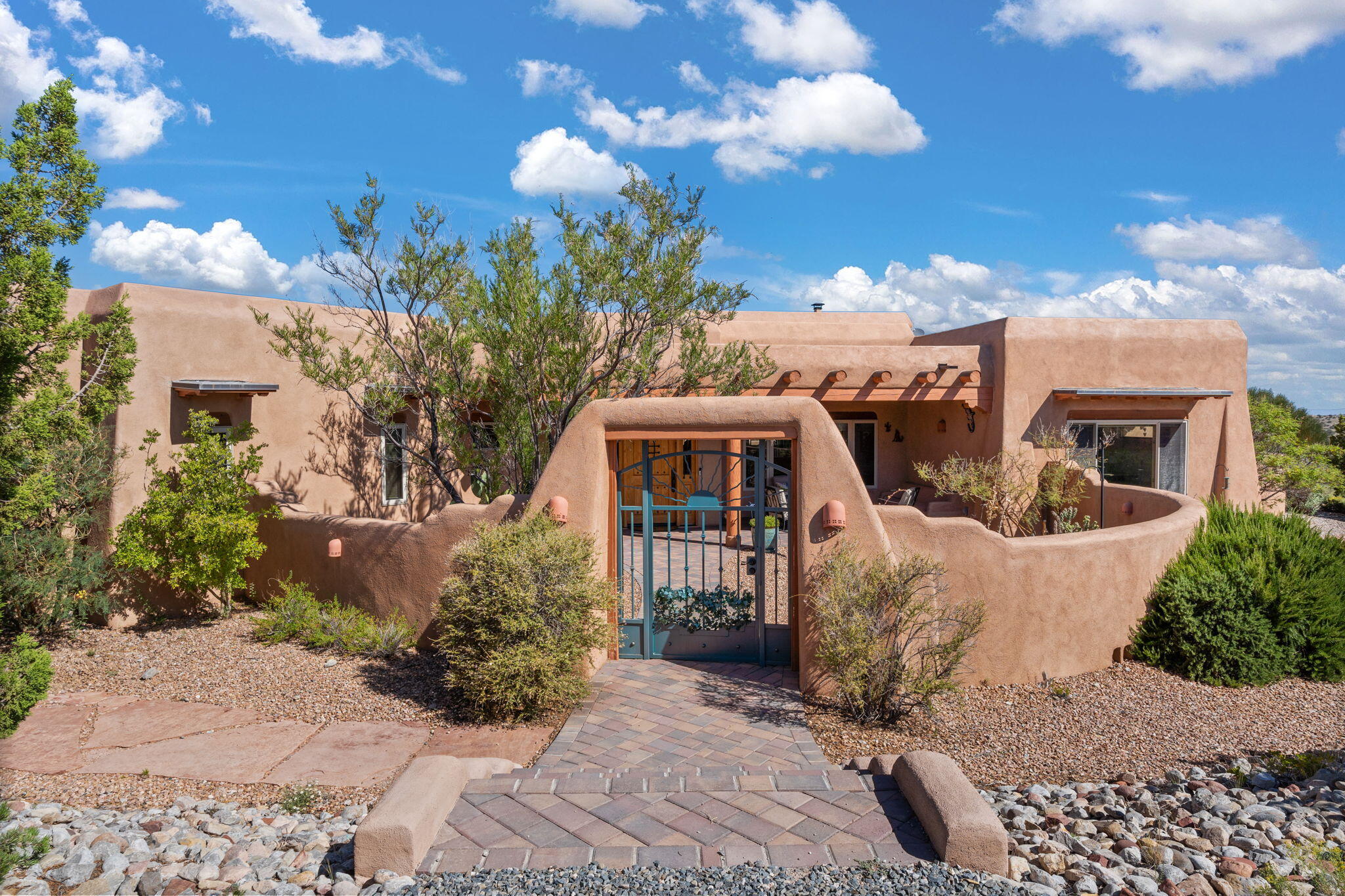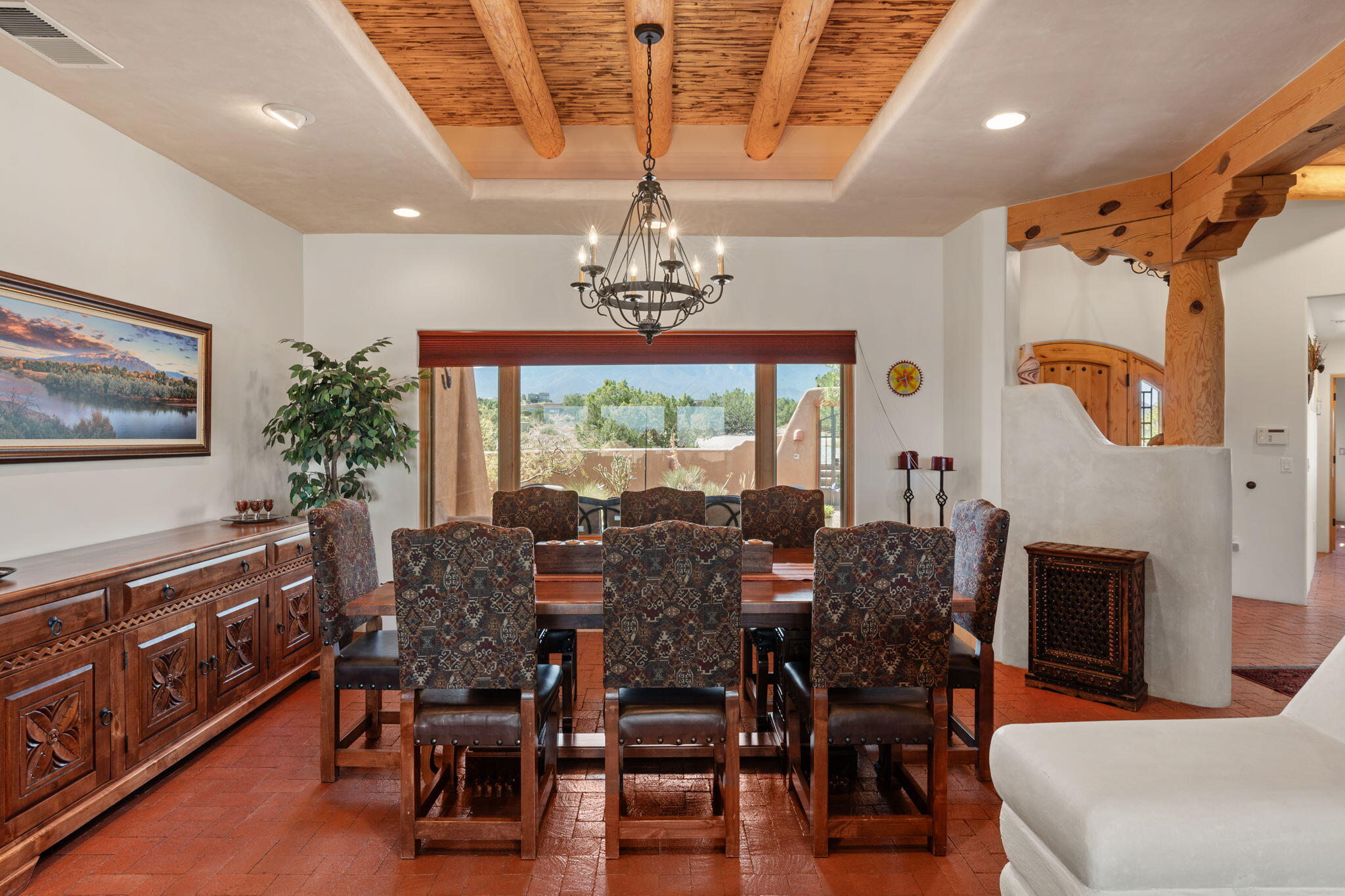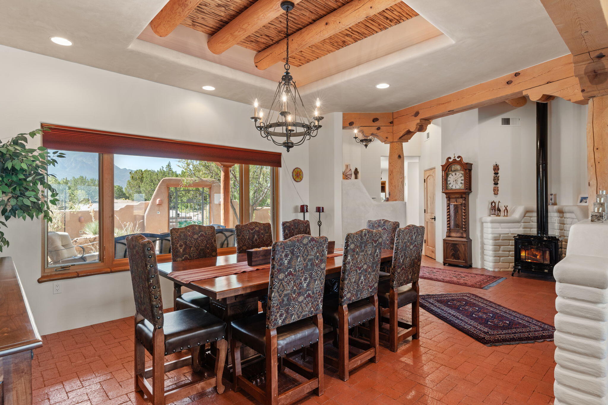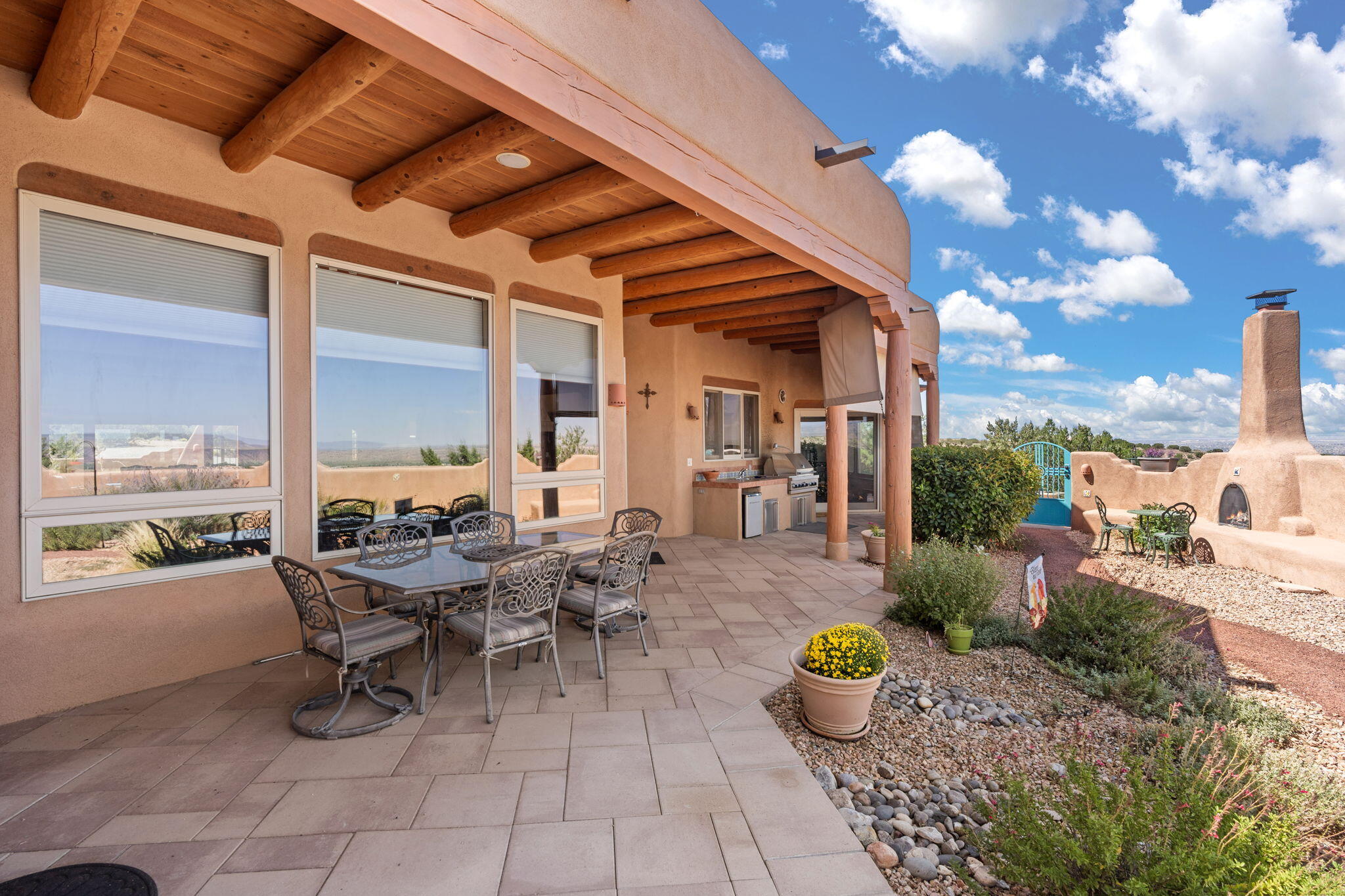 Exquisite Custom Placitas Home situated on over 3.7 acres with Stunning Views! Welcoming courtyards leads you into the open & bright floorplan boasting architectural & design details throughout that include raised wood beamed & vigas ceilings; brick floors w/radiant heat; builtins & bancos; custom doors & curved archways; & so much more(See seller's Upgrade & Feature page)! Well-appointed Chef's kitchen w/Stainless Steel built in appliances including a warming drawer & pot filler; gorgeous granite counters & cabinets; & large pantry, opening to the greatroom w/custom kiva fireplace; & built-in entertainment center. Primary suite is a true retreat w/kiva fireplace & spa light ensuite w/relaxing soaking tub & steam shower; 2 walk-in closets w/custom California Closet storage.