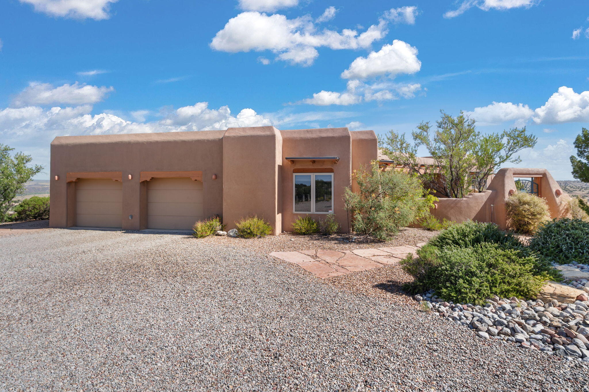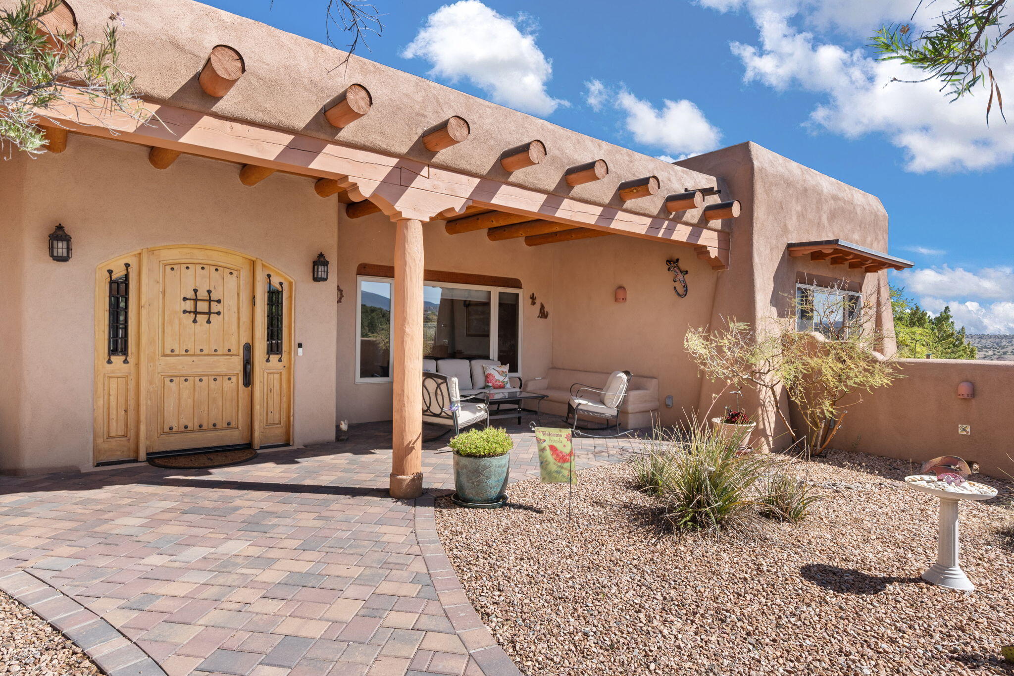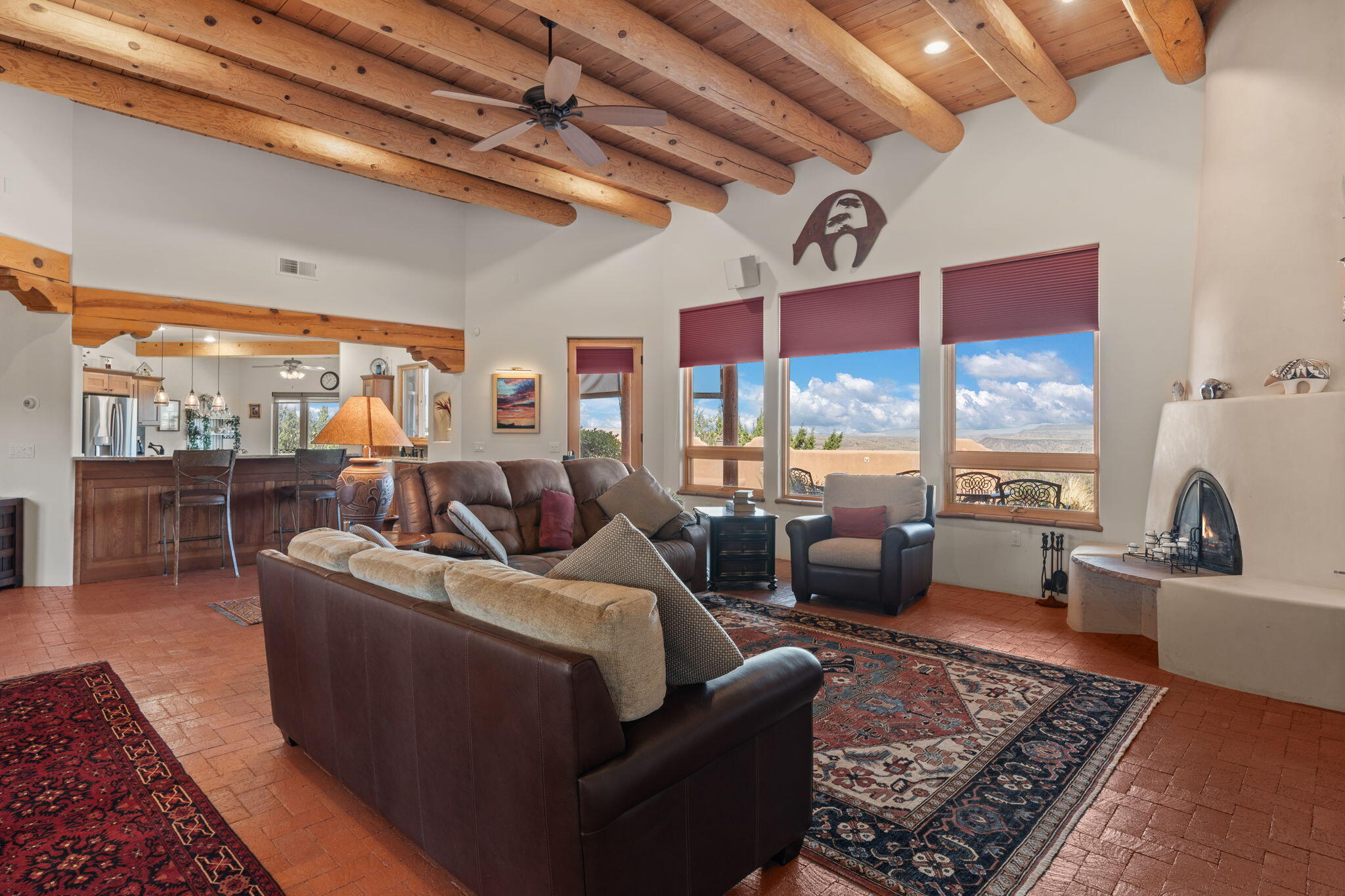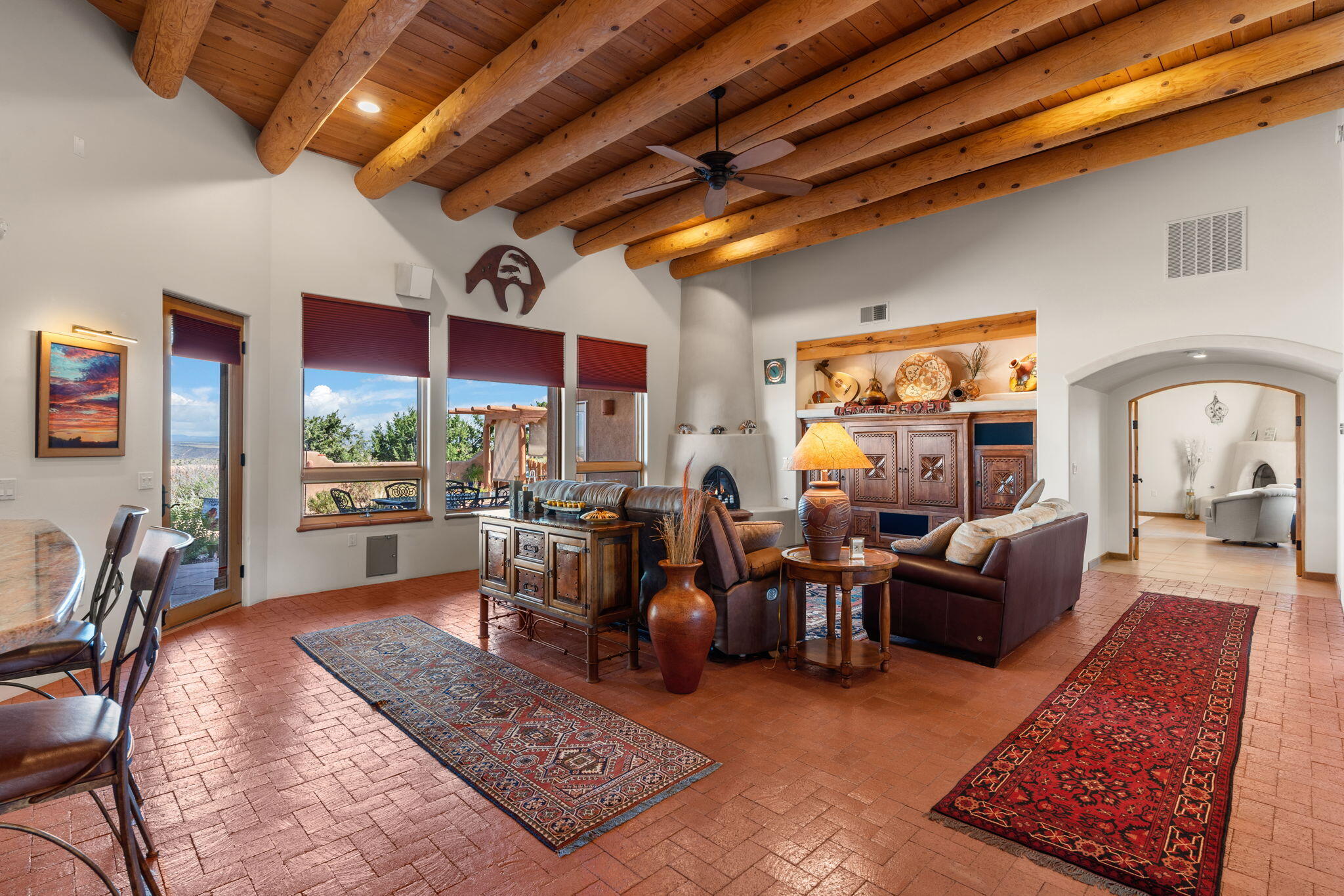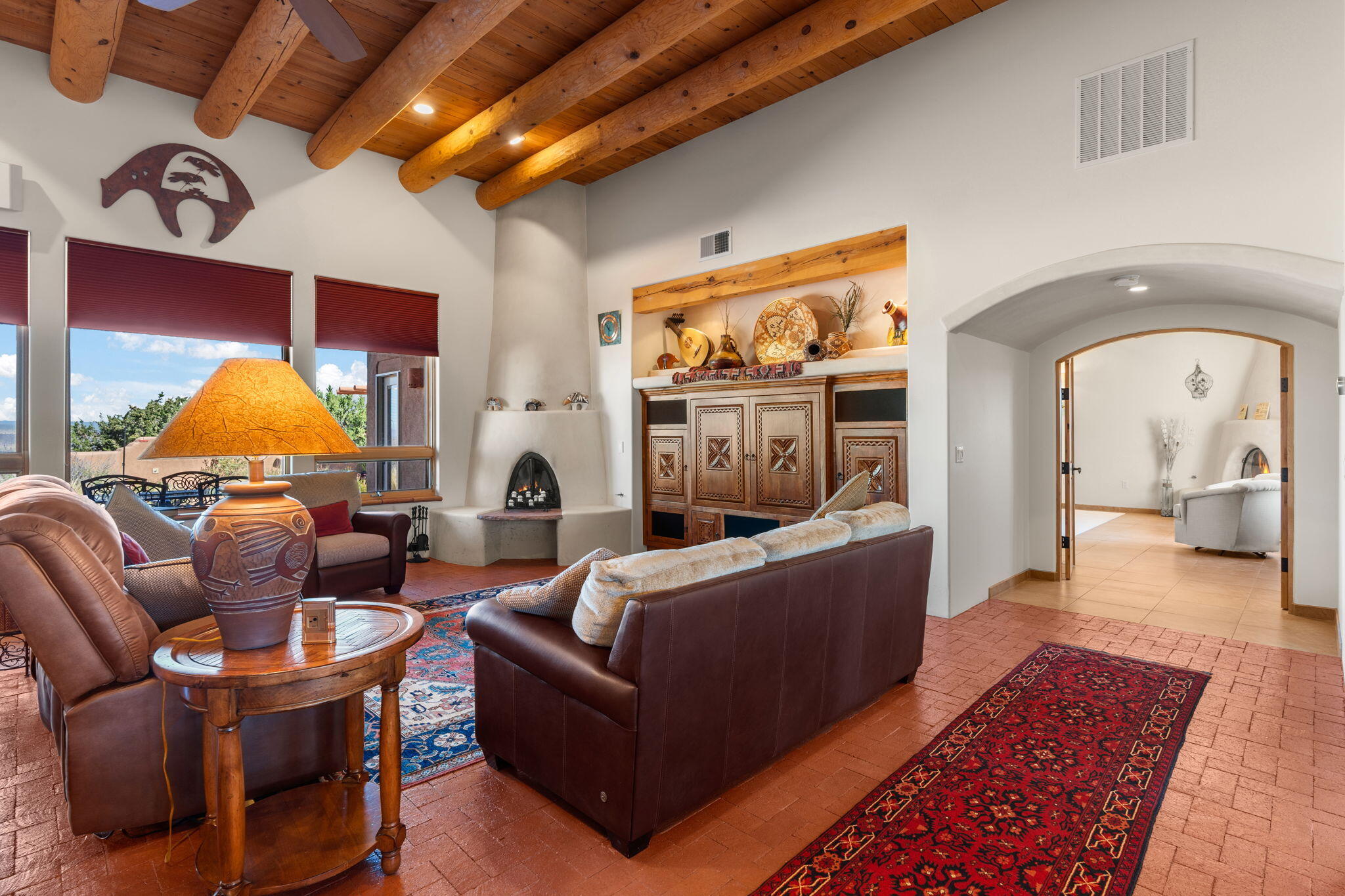 Exquisite Custom Placitas Home situated on over 3.7 acres with Stunning Views! Welcoming courtyards leads you into the open & bright floorplan boasting architectural & design details throughout that include raised wood beamed & vigas ceilings; brick floors w/radiant heat; builtins & bancos; custom doors & curved archways; & so much more(See seller's Upgrade & Feature page)! Well-appointed Chef's kitchen w/Stainless Steel built in appliances including a warming drawer & pot filler; gorgeous granite counters & cabinets; & large pantry, opening to the greatroom w/custom kiva fireplace; & built-in entertainment center. Primary suite is a true retreat w/kiva fireplace & spa light ensuite w/relaxing soaking tub & steam shower; 2 walk-in closets w/custom California Closet storage.