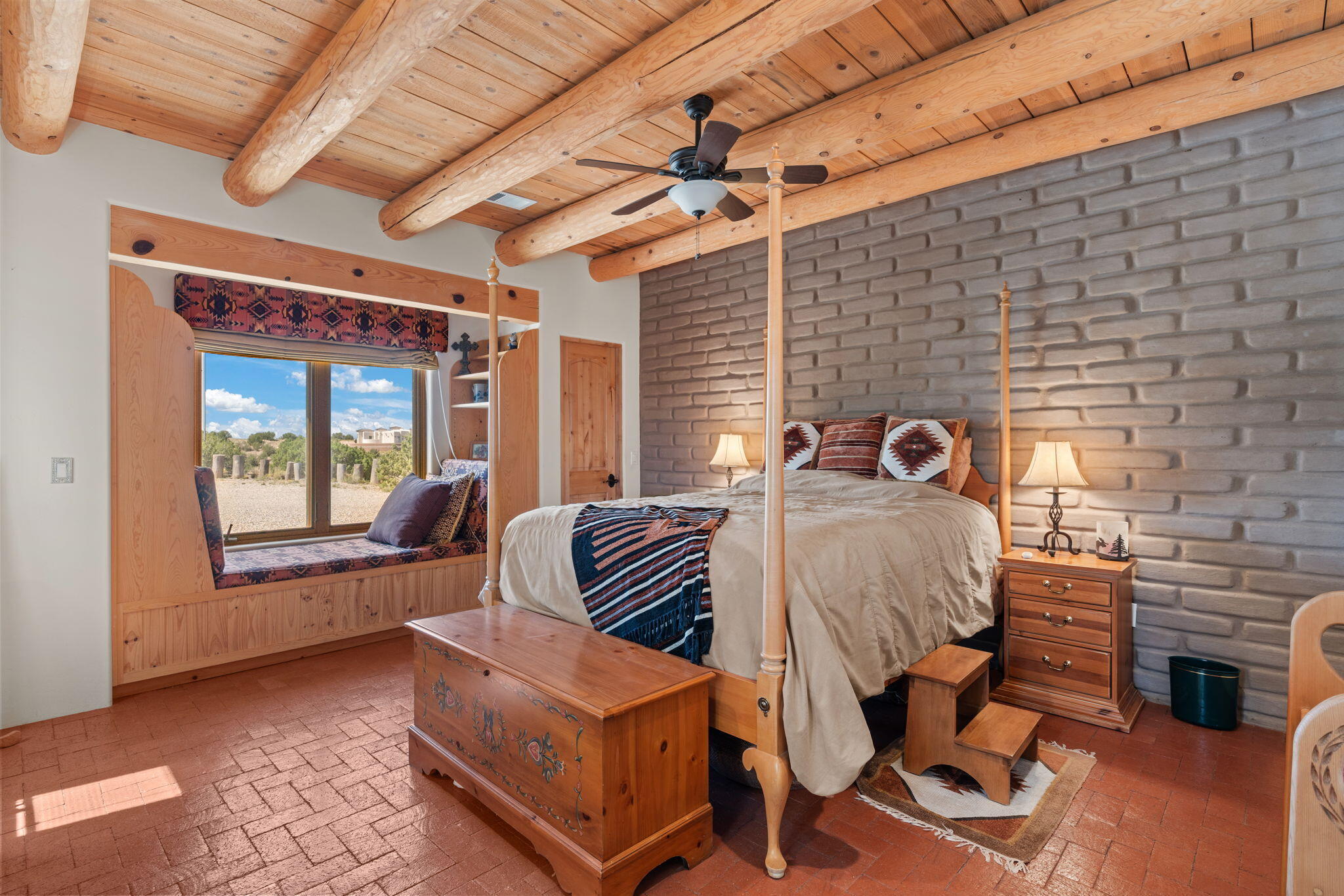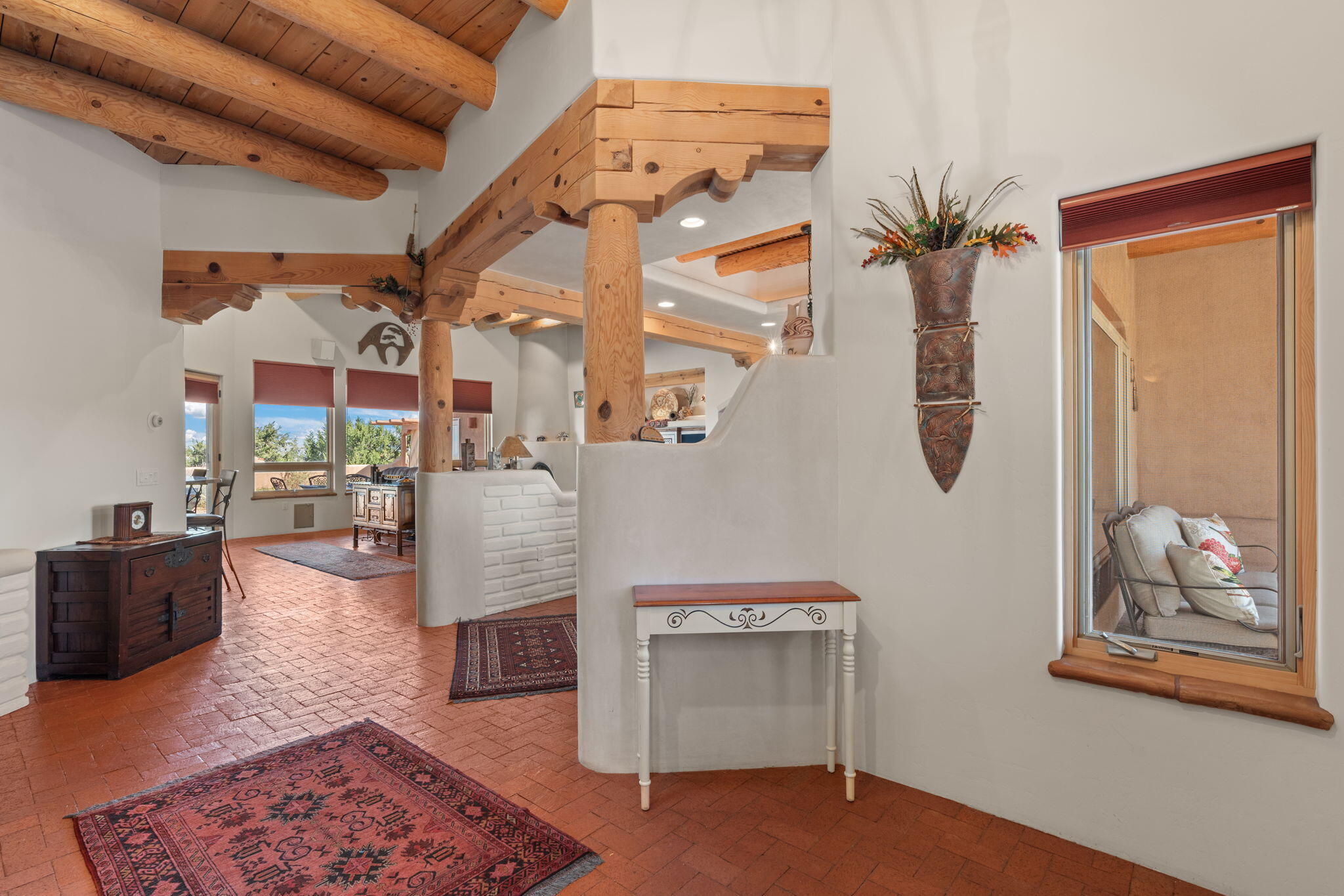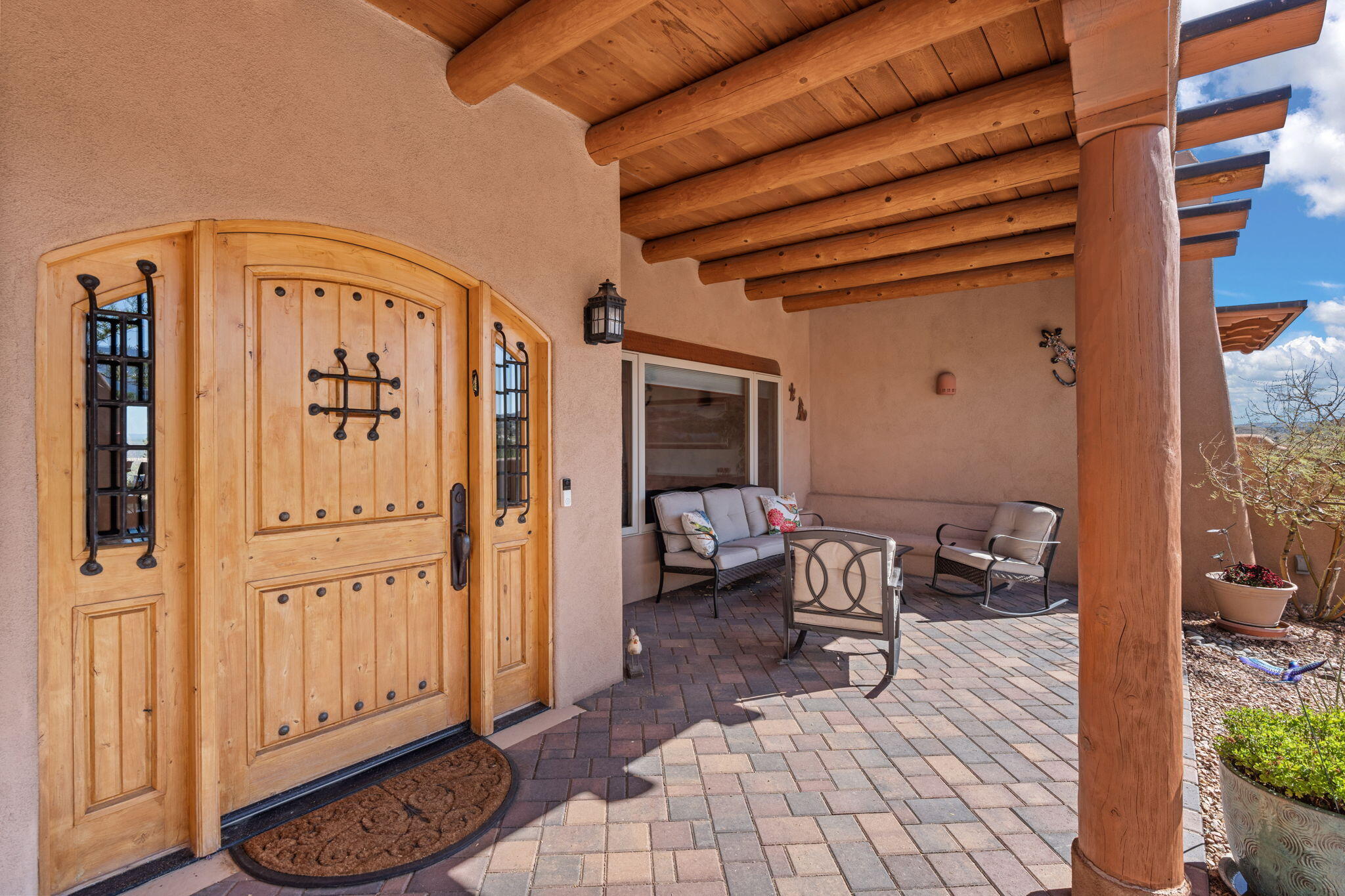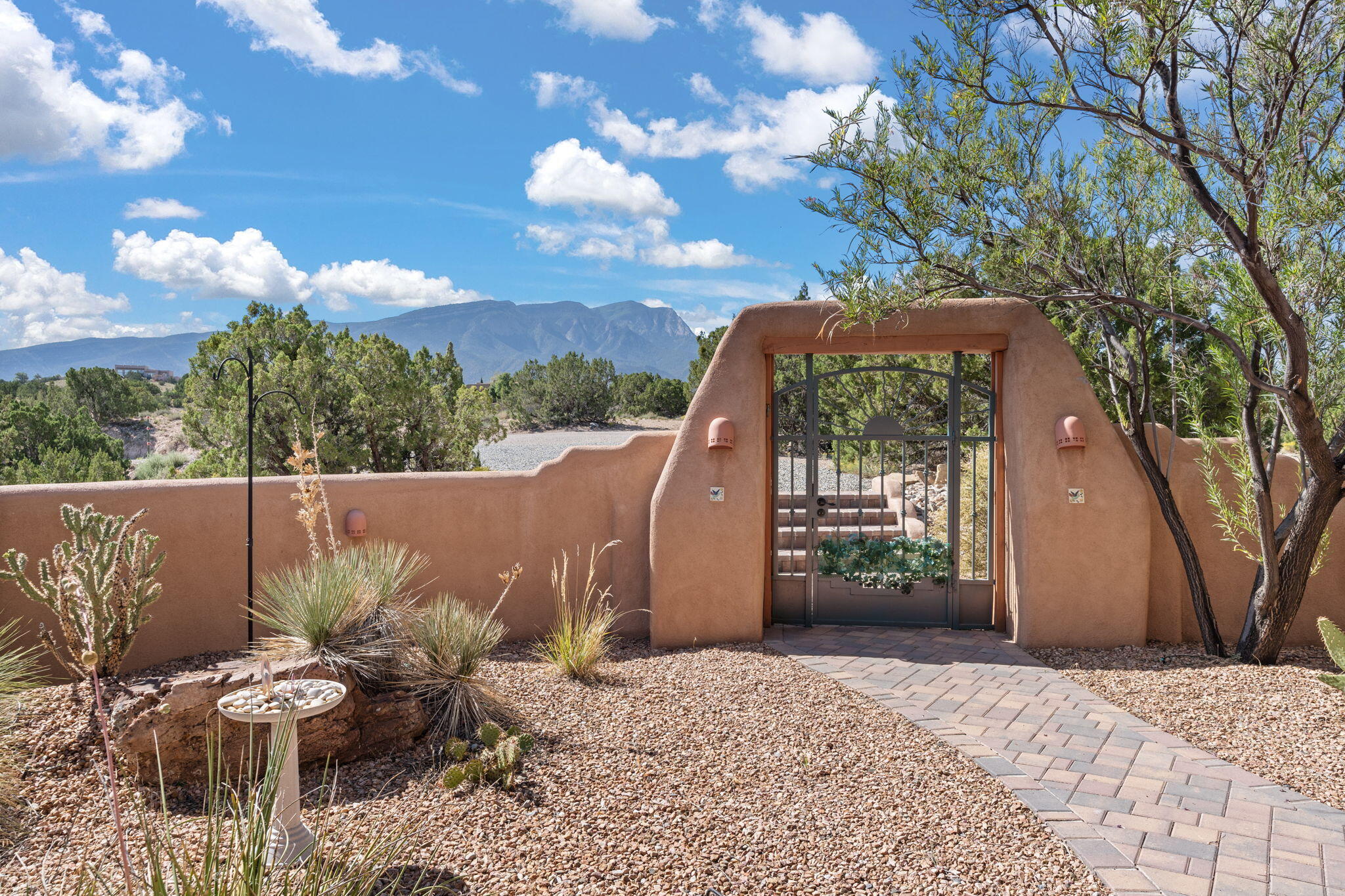 Exquisite Custom Placitas Home situated on over 3.7 acres with Stunning Views! Welcoming courtyards leads you into the open & bright floorplan boasting architectural & design details throughout that include raised wood beamed & vigas ceilings; brick floors w/radiant heat; builtins & bancos; custom doors & curved archways; & so much more(See seller's Upgrade & Feature page)! Well-appointed Chef's kitchen w/Stainless Steel built in appliances including a warming drawer & pot filler; gorgeous granite counters & cabinets; & large pantry, opening to the greatroom w/custom kiva fireplace; & built-in entertainment center. Primary suite is a true retreat w/kiva fireplace & spa light ensuite w/relaxing soaking tub & steam shower; 2 walk-in closets w/custom California Closet storage.