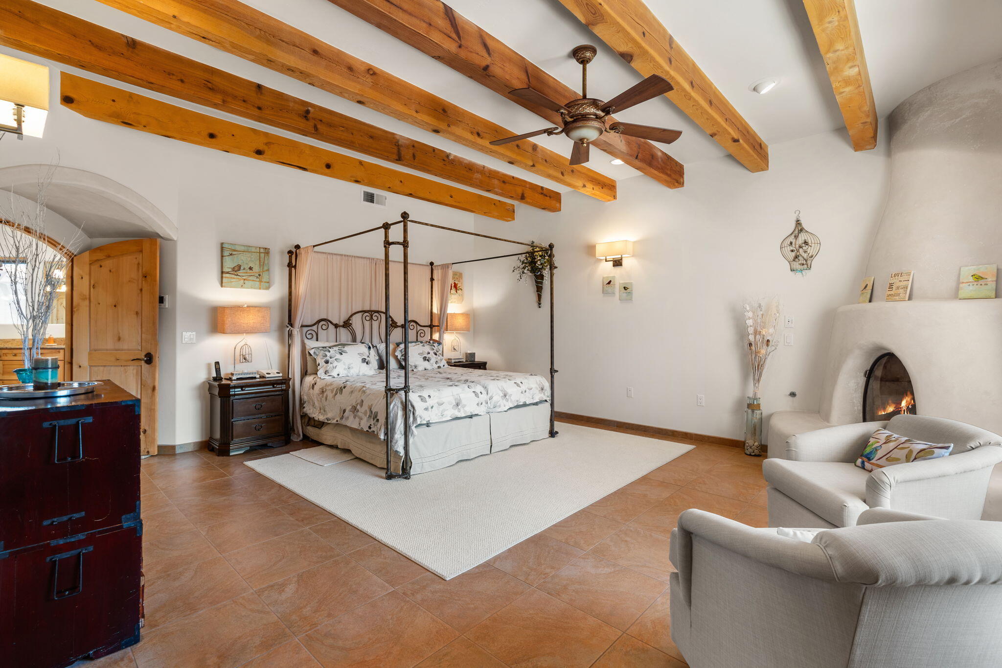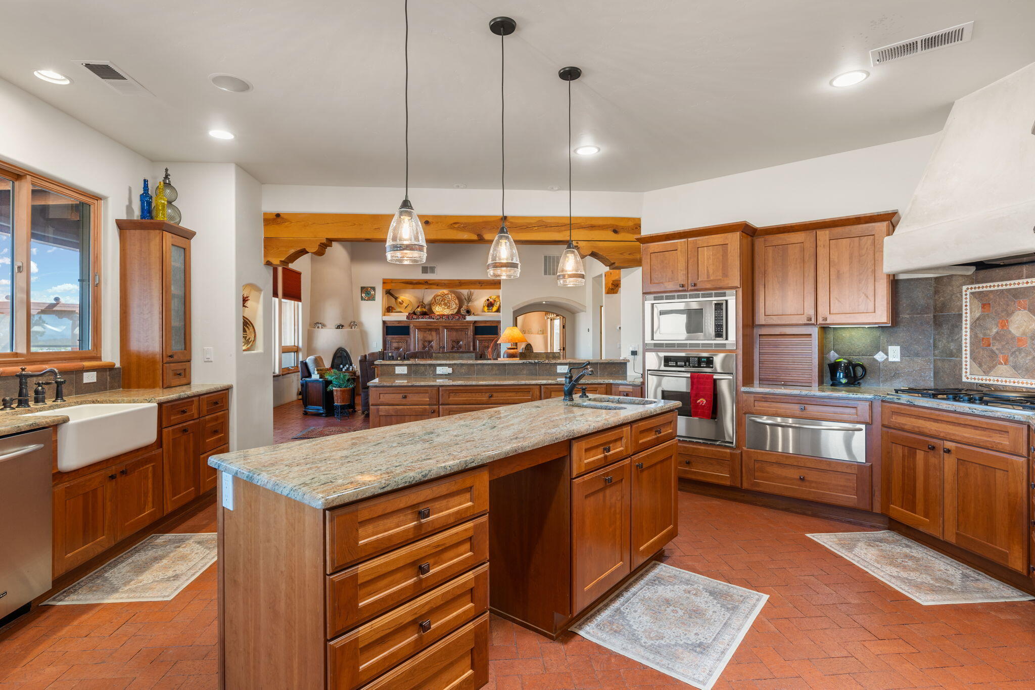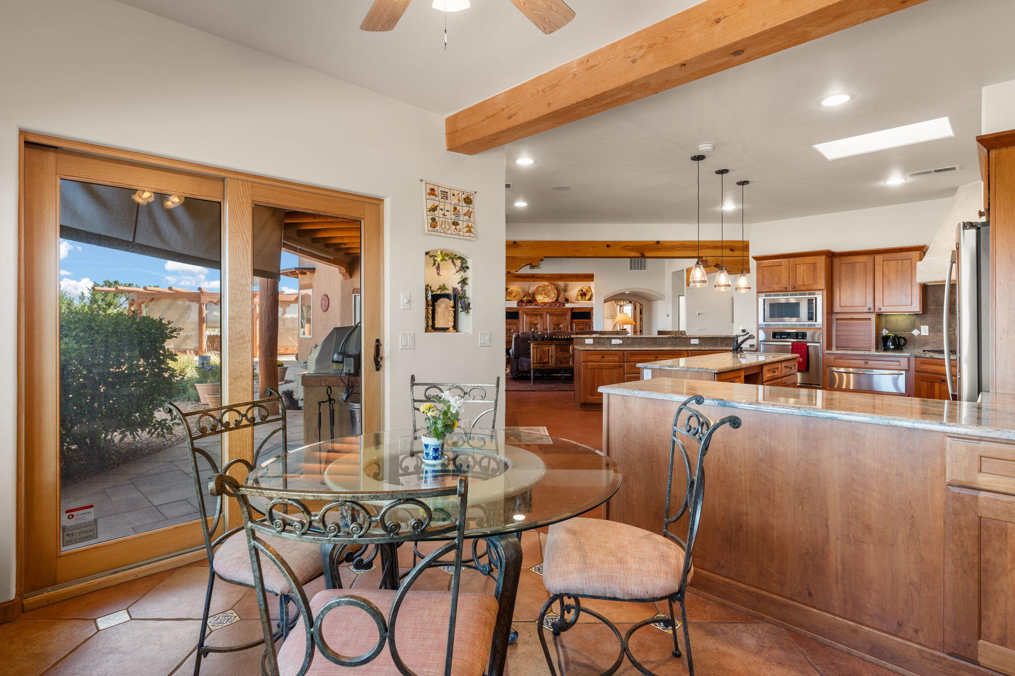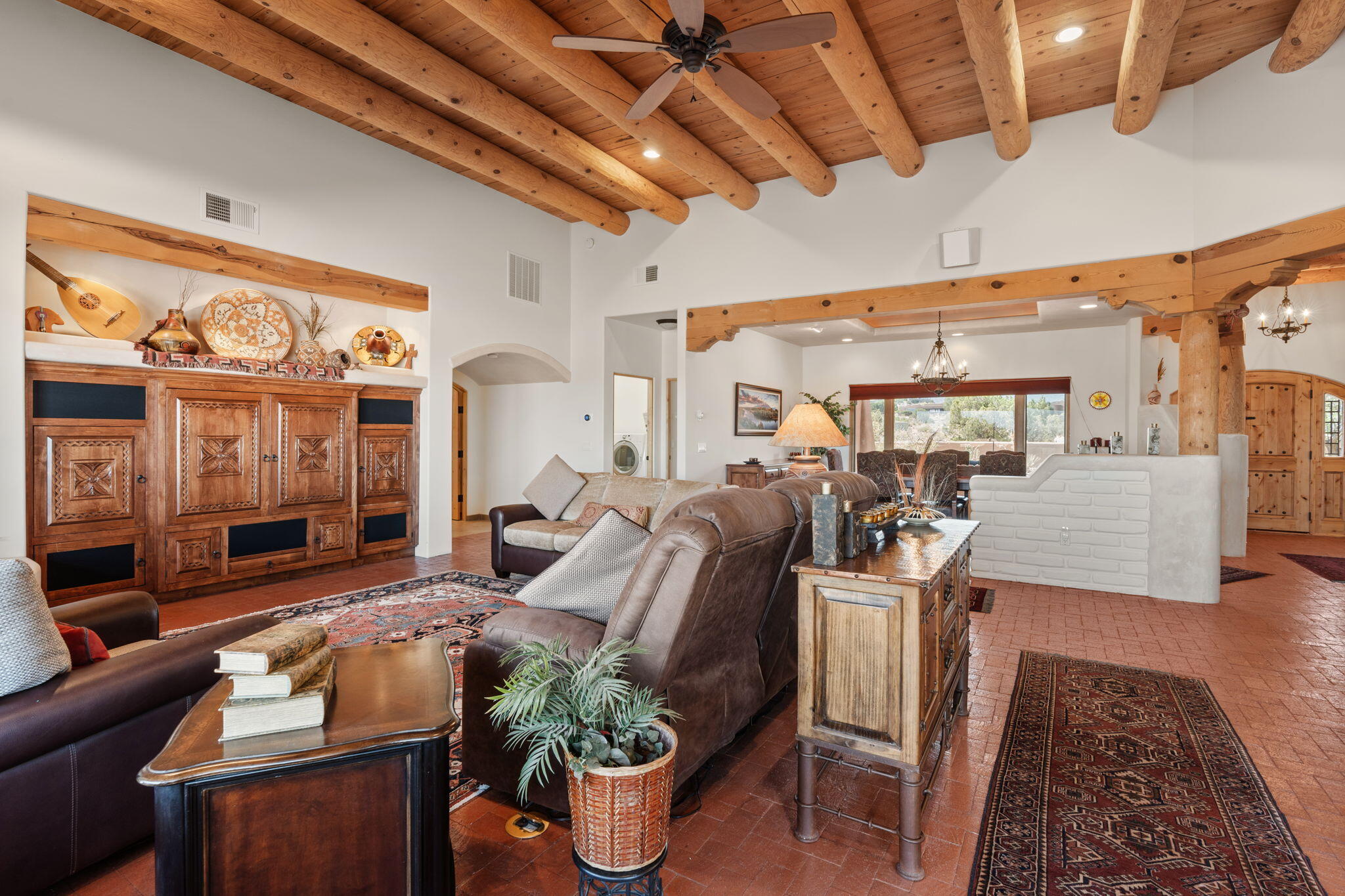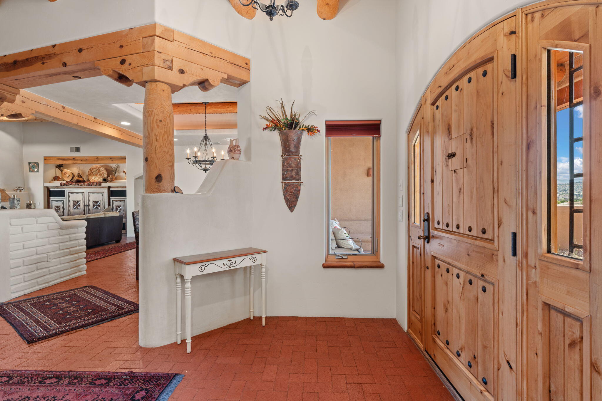 Exquisite Custom Placitas Home situated on over 3.7 acres with Stunning Views! Welcoming courtyards leads you into the open & bright floorplan boasting architectural & design details throughout that include raised wood beamed & vigas ceilings; brick floors w/radiant heat; builtins & bancos; custom doors & curved archways; & so much more(See seller's Upgrade & Feature page)! Well-appointed Chef's kitchen w/Stainless Steel built in appliances including a warming drawer & pot filler; gorgeous granite counters & cabinets; & large pantry, opening to the greatroom w/custom kiva fireplace; & built-in entertainment center. Primary suite is a true retreat w/kiva fireplace & spa light ensuite w/relaxing soaking tub & steam shower; 2 walk-in closets w/custom California Closet storage.