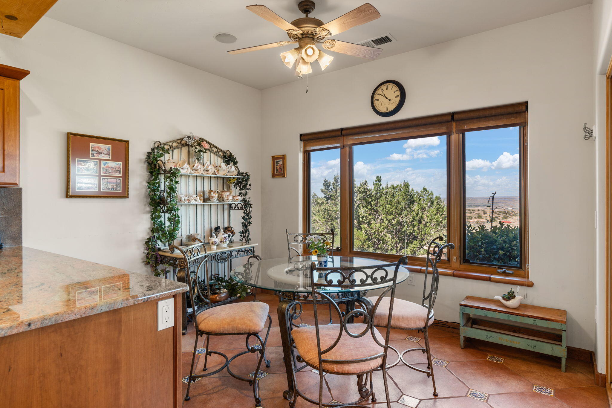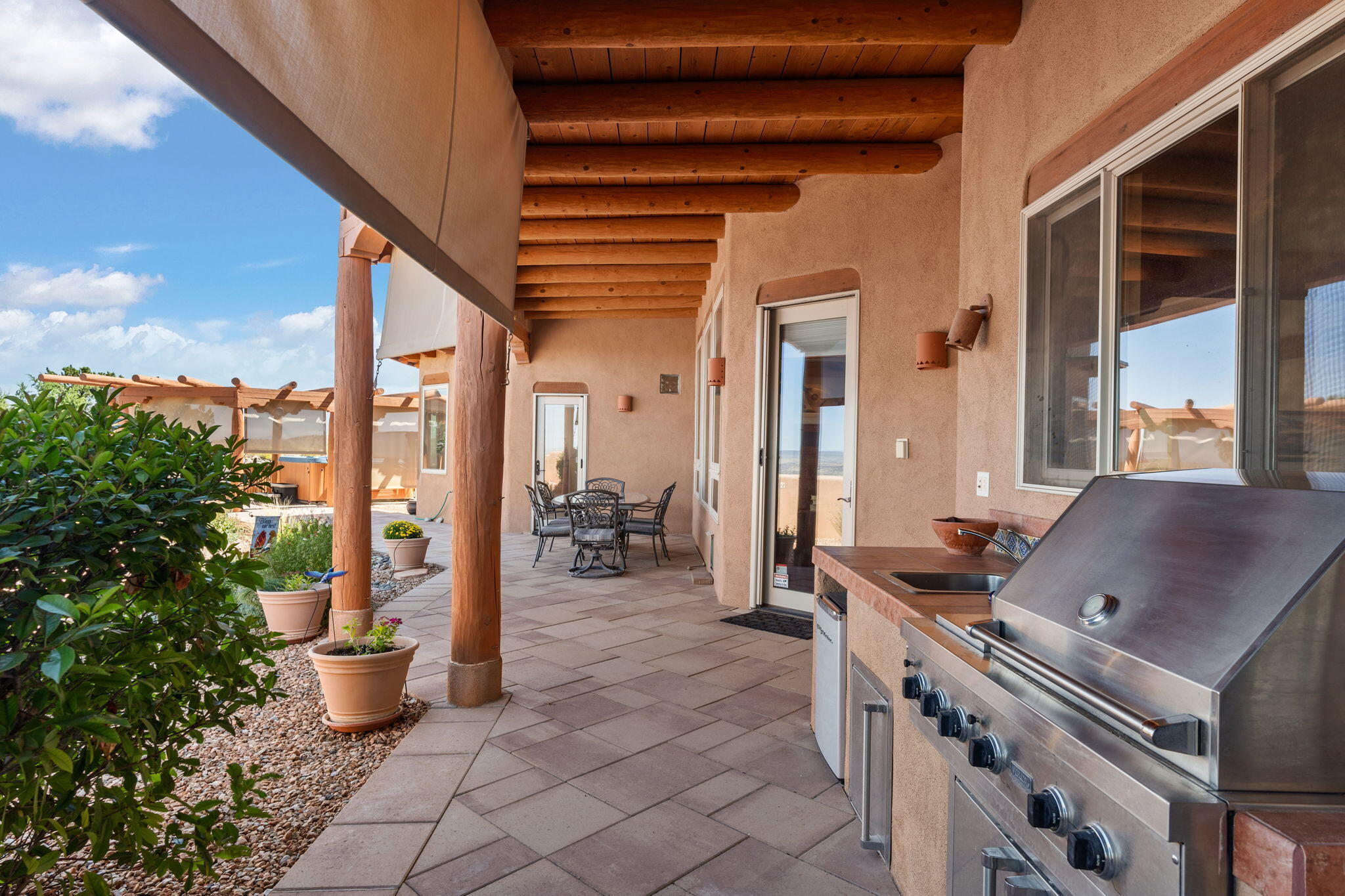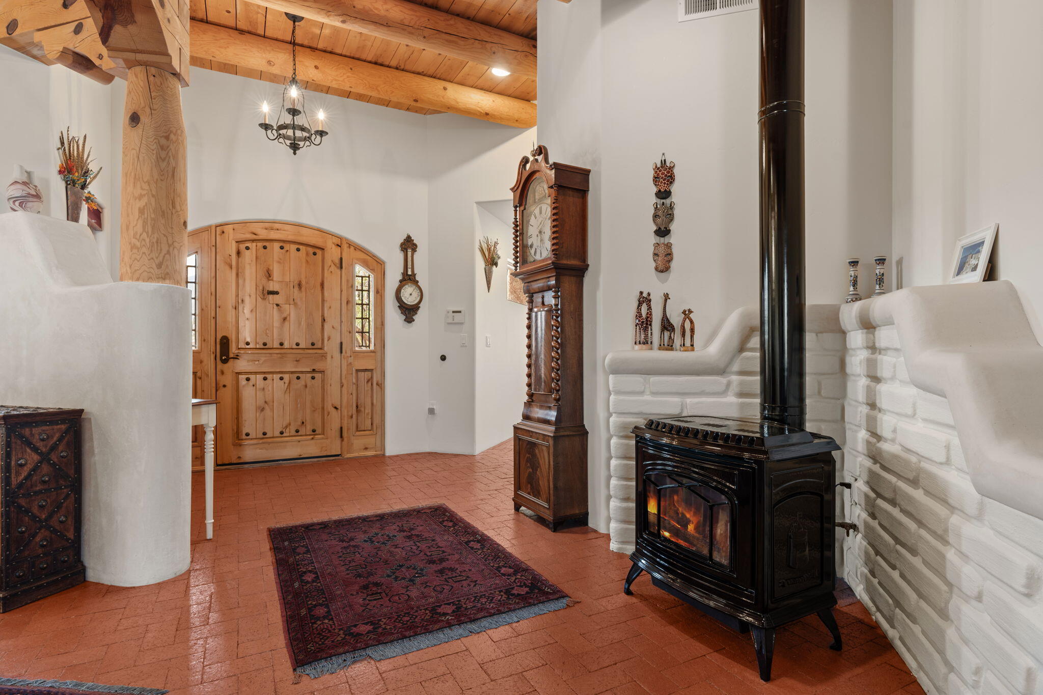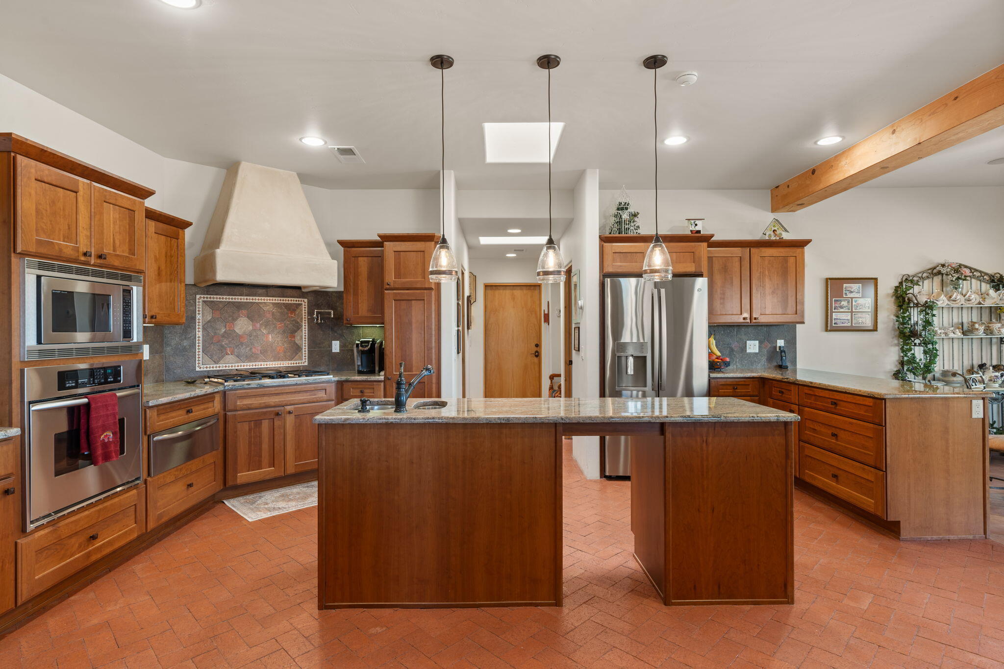 Exquisite Custom Placitas Home situated on over 3.7 acres with Stunning Views! Welcoming courtyards leads you into the open & bright floorplan boasting architectural & design details throughout that include raised wood beamed & vigas ceilings; brick floors w/radiant heat; builtins & bancos; custom doors & curved archways; & so much more(See seller's Upgrade & Feature page)! Well-appointed Chef's kitchen w/Stainless Steel built in appliances including a warming drawer & pot filler; gorgeous granite counters & cabinets; & large pantry, opening to the greatroom w/custom kiva fireplace; & built-in entertainment center. Primary suite is a true retreat w/kiva fireplace & spa light ensuite w/relaxing soaking tub & steam shower; 2 walk-in closets w/custom California Closet storage.