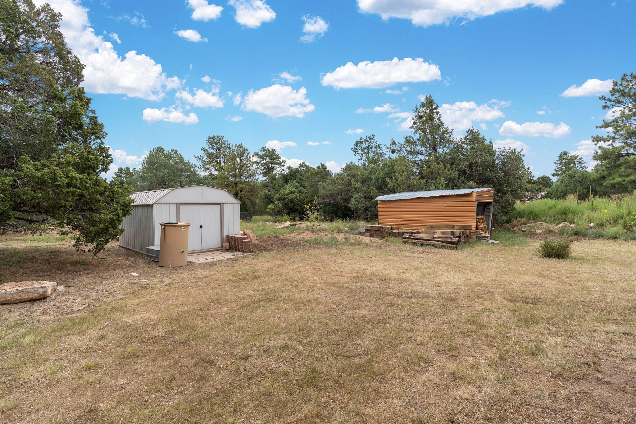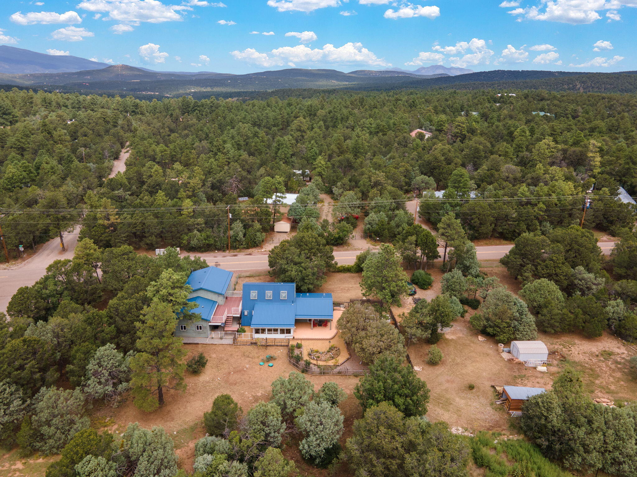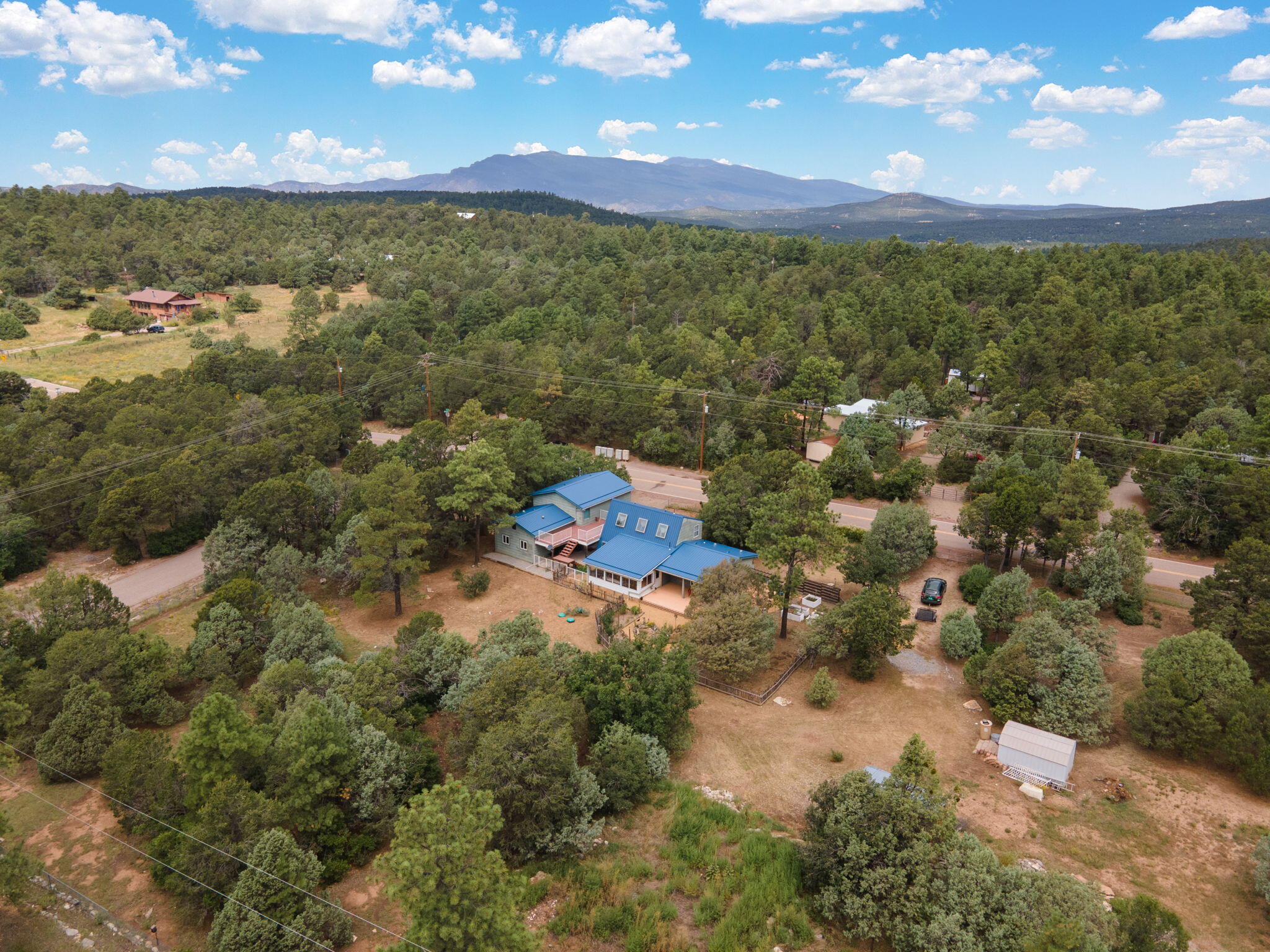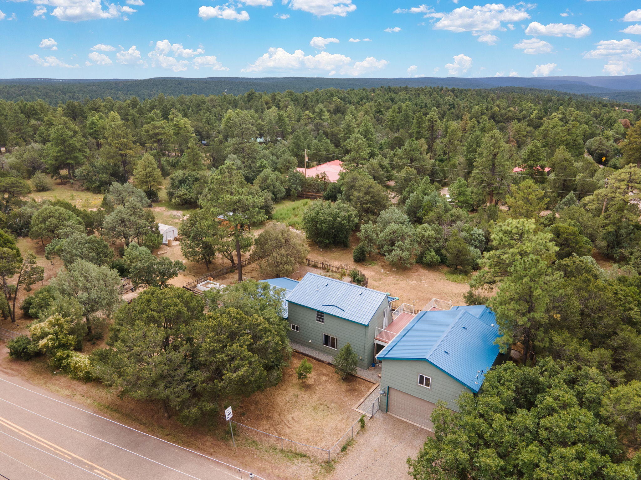 Discover this fantastic opportunity to live in the Mountains and Pines of Tijeras. This lovely 2 bedroom, 1 bathroom property offers Space, Flexibility, Comfort and Land. The main house has an open floor plan concept with a loft with pitched ceiling that offers more flexibility as a hobby room, game room or office. From the great room find big beautiful views of your own private oasis , mature trees, grassy lawn, and bird watching. Container gardening in place. Horses are a possibility here on this peaceful property. A second structure provides an oversized 2 cg, and attic for storage(must see). A fully finished heated guest suite currently being used as an exercise room with a private sauna, perfect for unwinding after a busy day. Entire property is fenced. Experience this