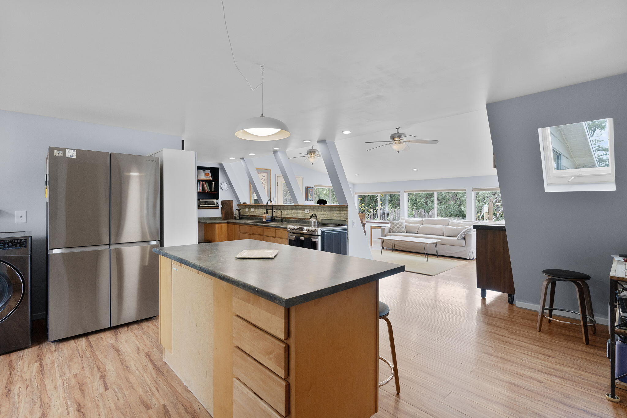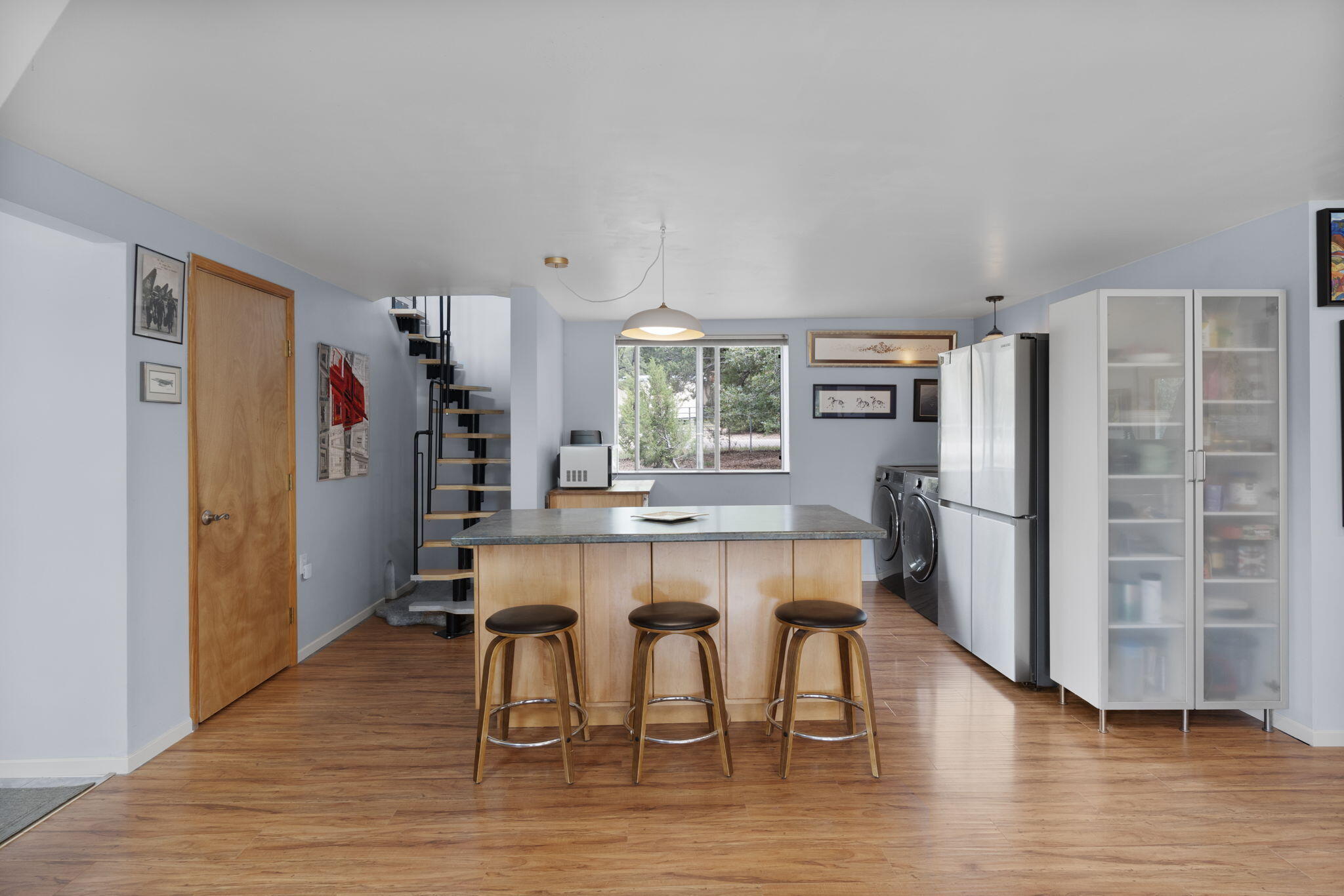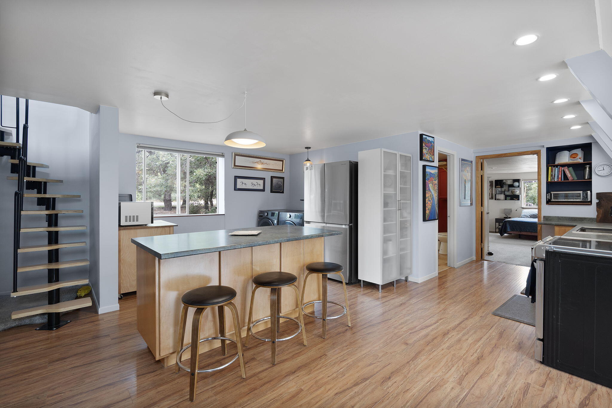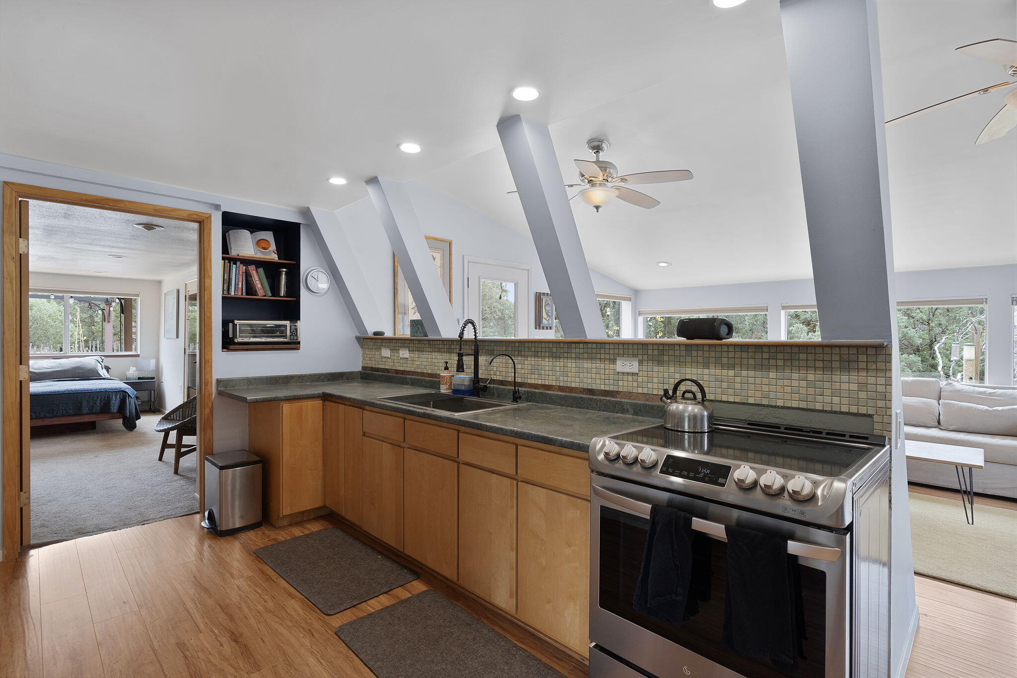 Discover this fantastic opportunity to live in the Mountains and Pines of Tijeras. This lovely 2 bedroom, 1 bathroom property offers Space, Flexibility, Comfort and Land. The main house has an open floor plan concept with a loft with pitched ceiling that offers more flexibility as a hobby room, game room or office. From the great room find big beautiful views of your own private oasis , mature trees, grassy lawn, and bird watching. Container gardening in place. Horses are a possibility here on this peaceful property. A second structure provides an oversized 2 cg, and attic for storage(must see). A fully finished heated guest suite currently being used as an exercise room with a private sauna, perfect for unwinding after a busy day. Entire property is fenced. Experience this